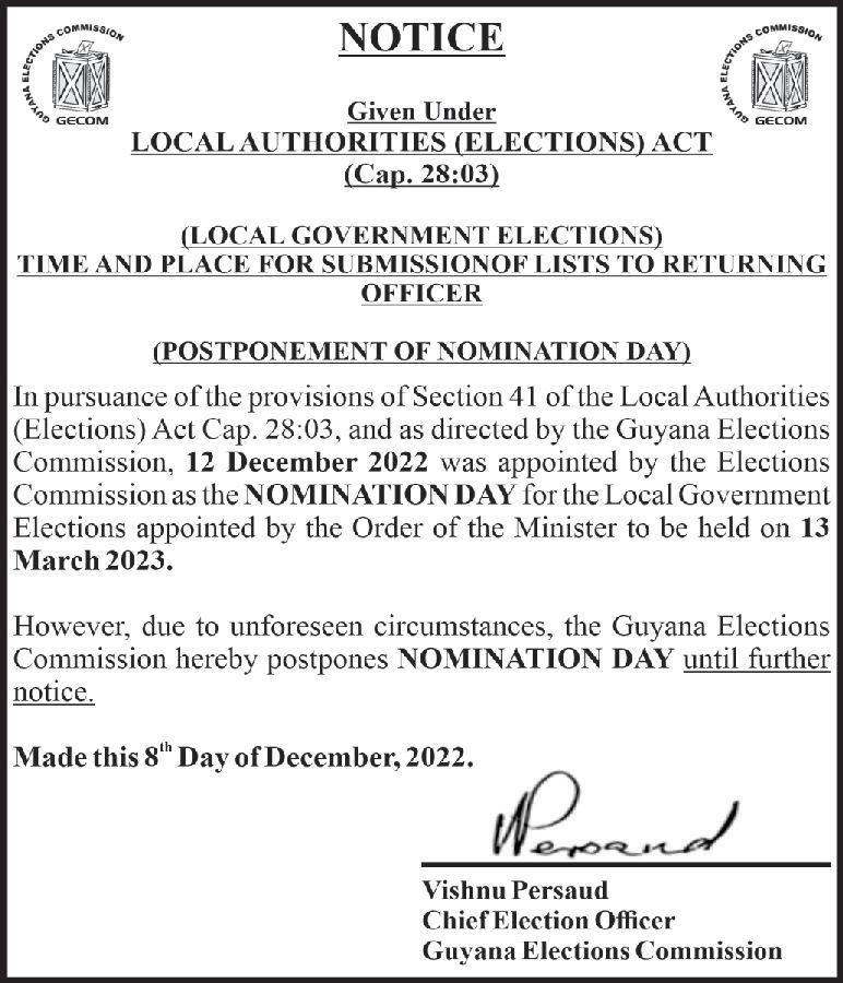 GECOMhasalsodecided on addressing issues concerning the Voters List and thus postponed Nomination Day for LGE. Providing an update to this publication, Opposition Commissioner, Vincent Alexander said that it was agreed by all Commissioners