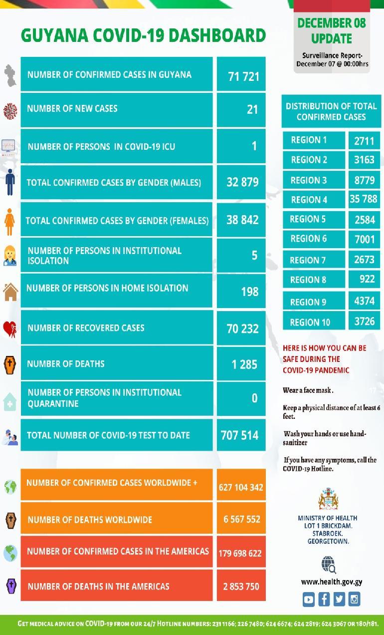In October some 89 because over the last two So this is something that persons tested positive for weeks the cases in Guyana wewoulddoroutinelytoget COVID-19 while a total of have been going up and anideaofwhatiscirculating 189 persons tested positive hospitalization has been andwhatweneedtolookout for the virus in November goingup,”hesaidduringhis for,”hehaddisclosed. with three COVID-19 COVID-19 update on Persons are urged to get related deaths. The latest Tuesday Dr Anthony noted vaccinated at any of the dashboard shows that one that the variants of the virus Ministry’s testing sites patient has been admitted to currently circulating mimic located across the country, the COVID-19 Intensive theinfluenzaviruswhichcan and continue to wear their Care Unit (ICU), five lead to persons mistakenly maskswheninpublicspaces.
