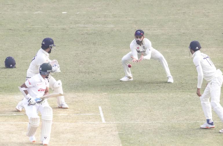 Bangladesh captain Shakib Al Hasan to give Virat Kohli a catch at slip for three, reducing Bangladesh to 755.