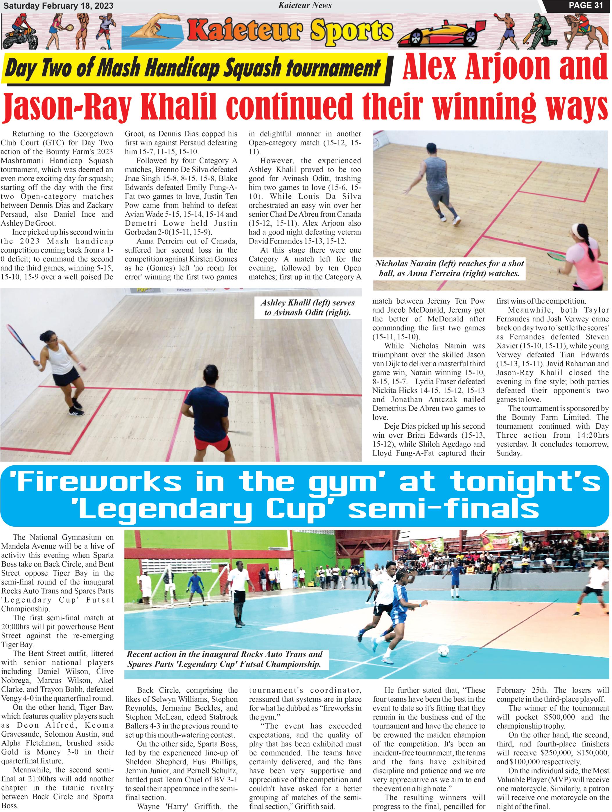 Returning to the Georgetown Club Court (GTC) for Day Two action of the Bounty Farm's 2023 Mashramani Handicap Squash tournament, which was deemed an even more exciting day for squash; starting off the day with the first two Open-category matches between Dennis Dias and Zackary Persaud, also Daniel Ince and AshleyDeGroot.