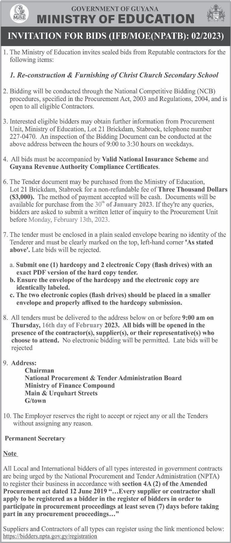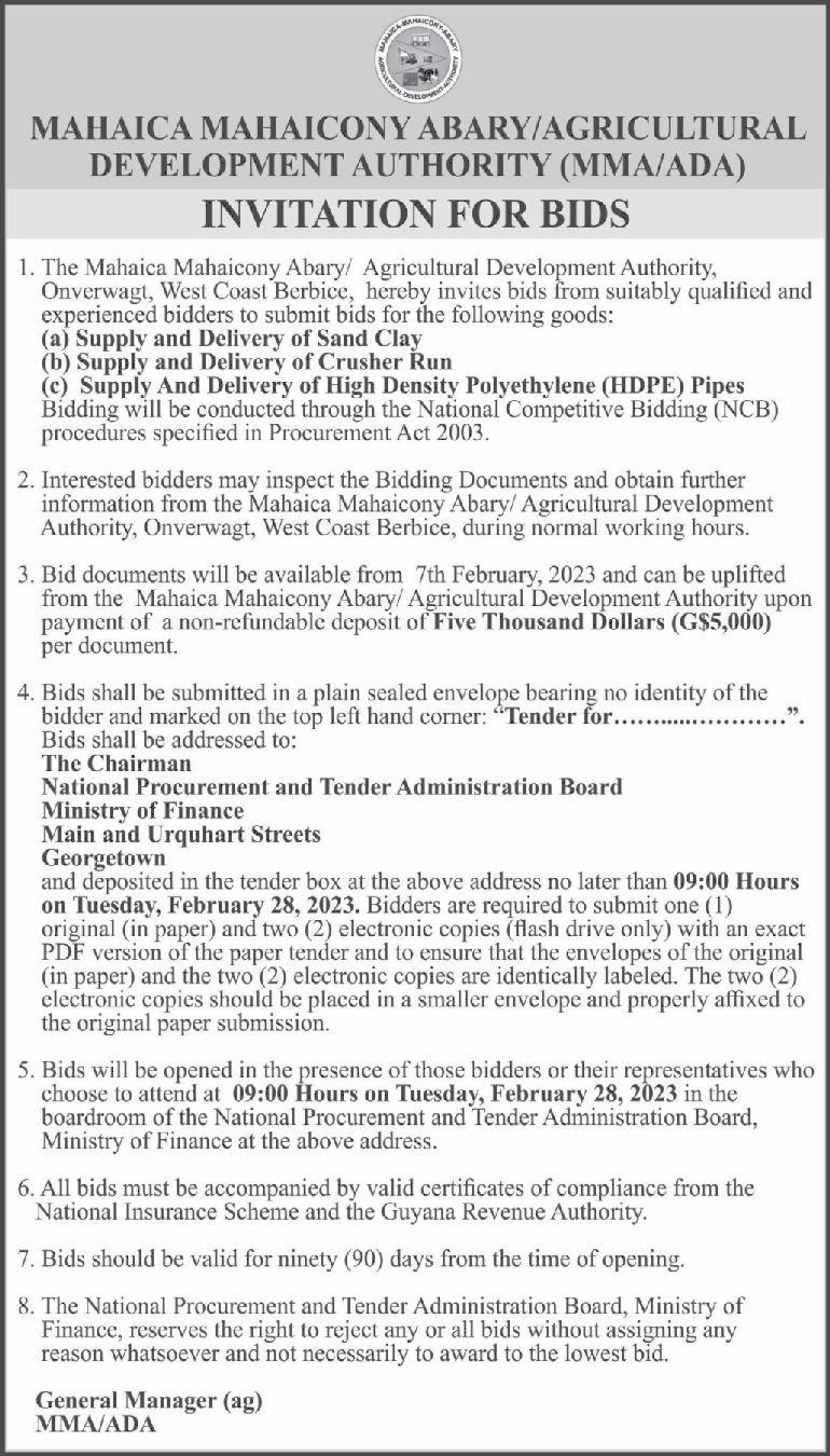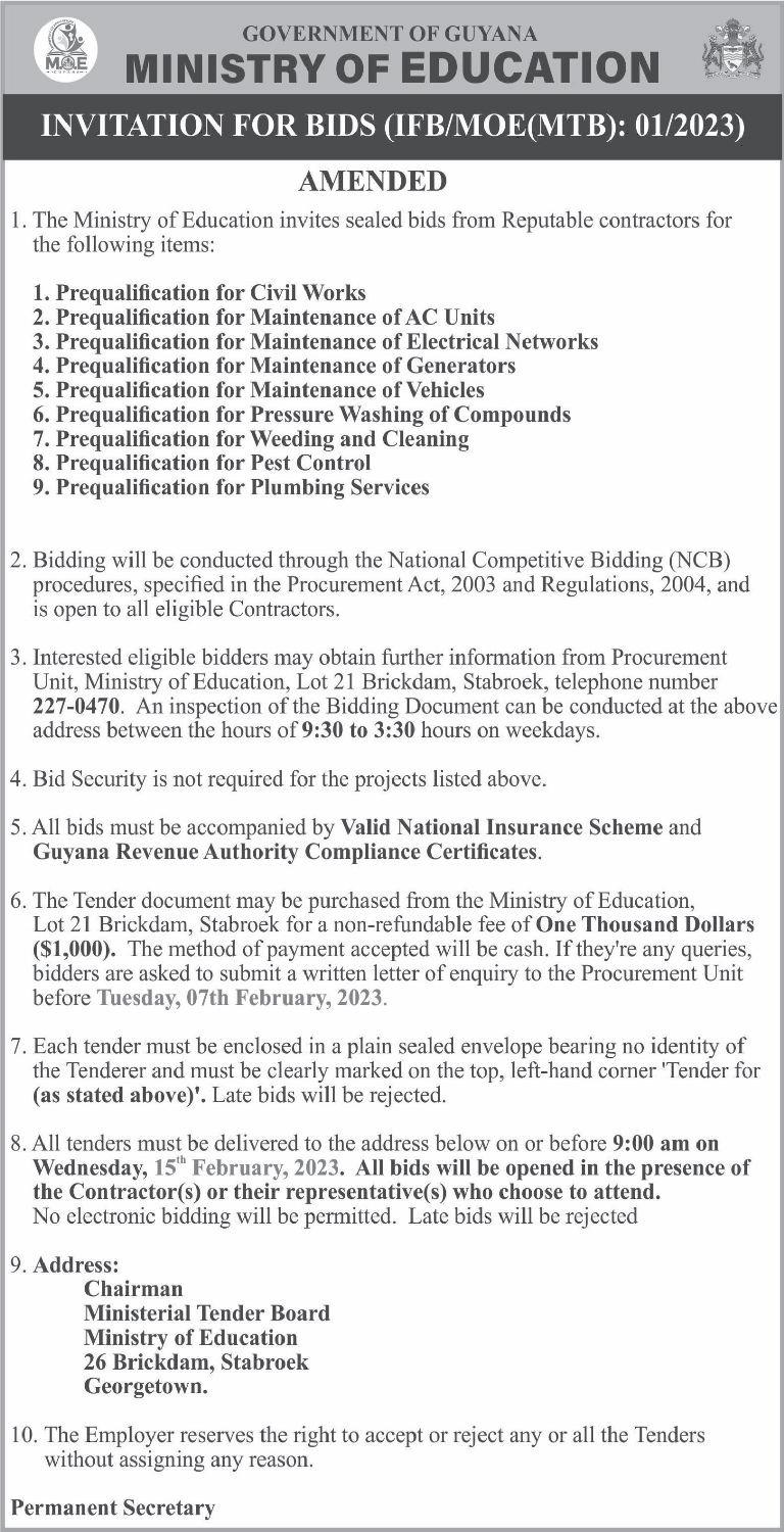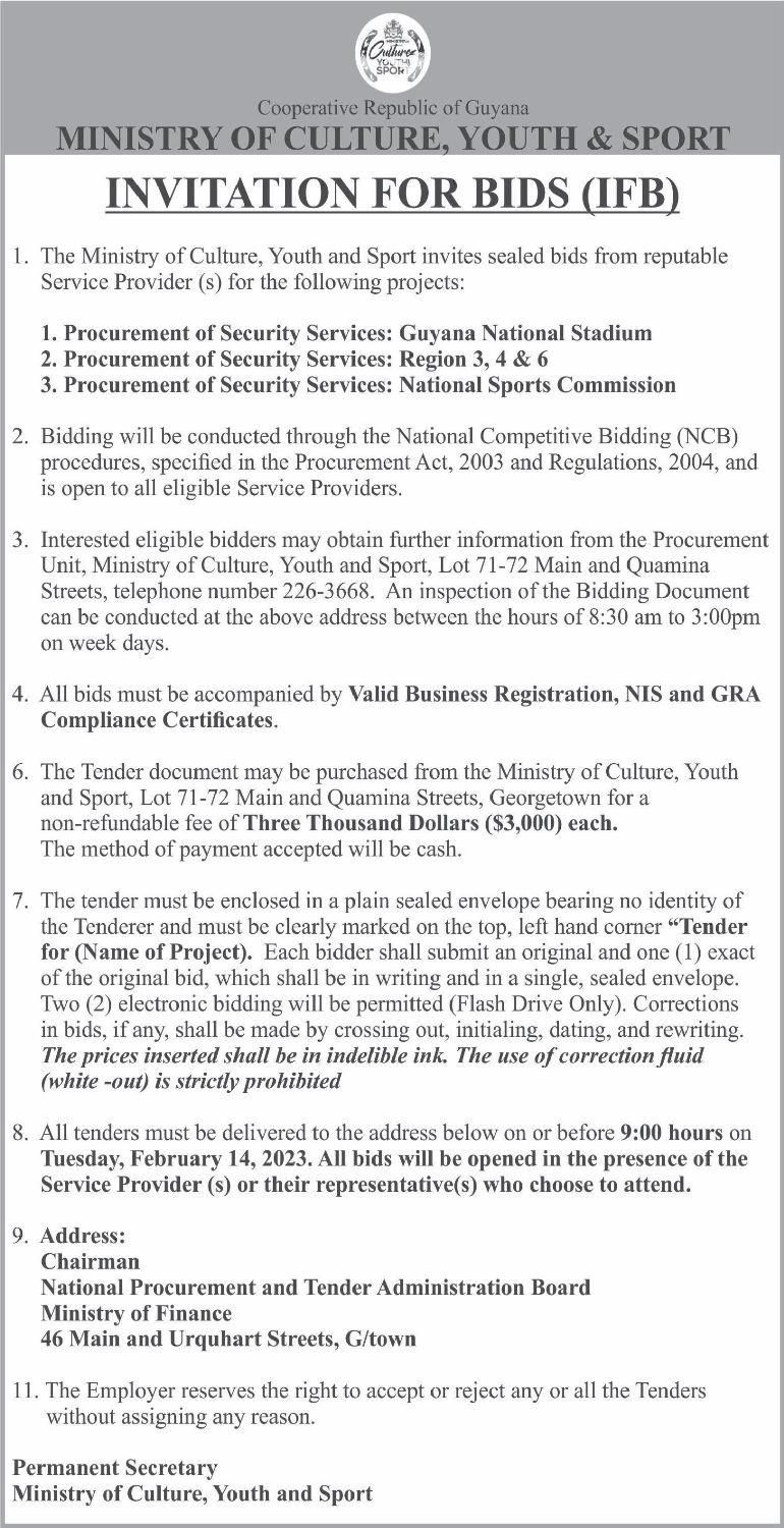 It was stated in the tender document that Investment Inc secured a $99,000,300 $150,000,000 each is estimated to continue contract to execute works for Phase Two of the repair of the roadways. The projects are the Canal No.1 road while Navin & Son slated to open on March 1, 2023 at the Construction was awarded a $ 93,181,410 National Procurement and Tender contracttoworkonPhaseTwoofCanalNo.2 AdministrationBoard(NPTAB)office. road.