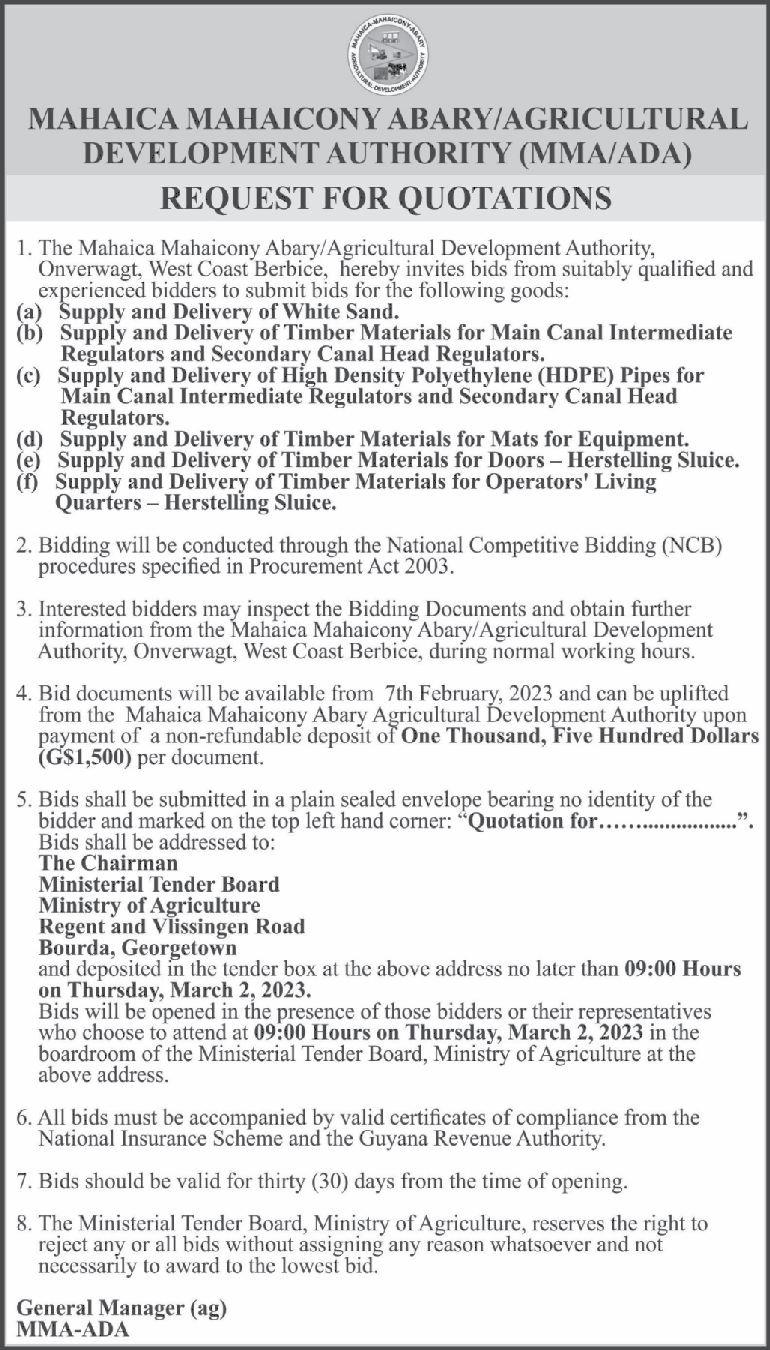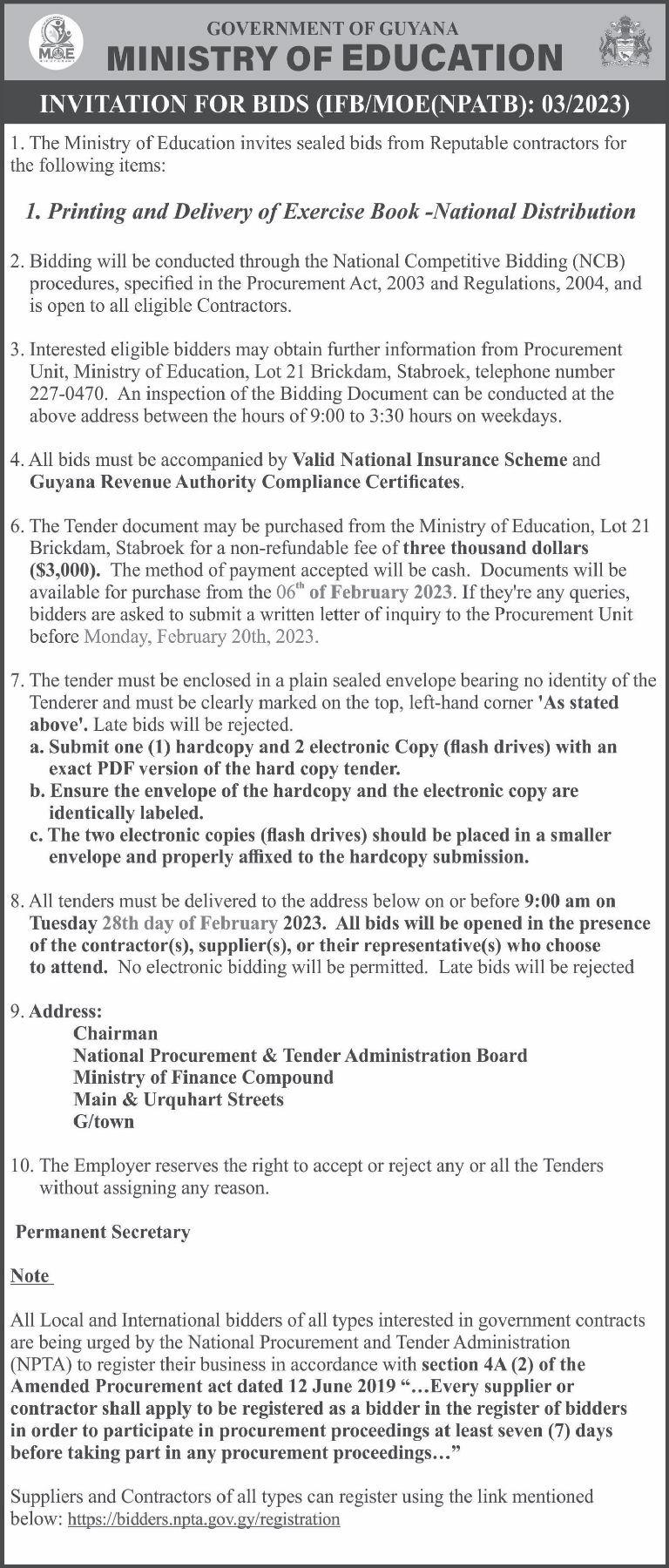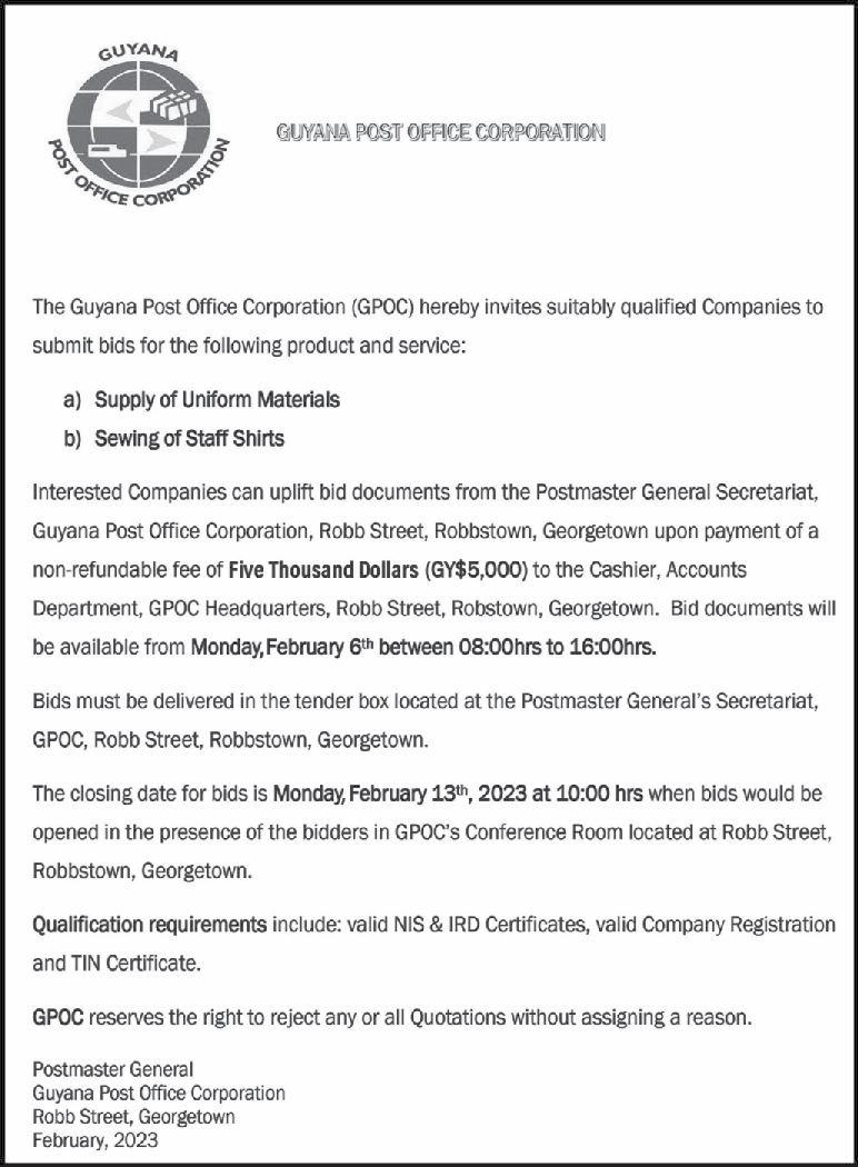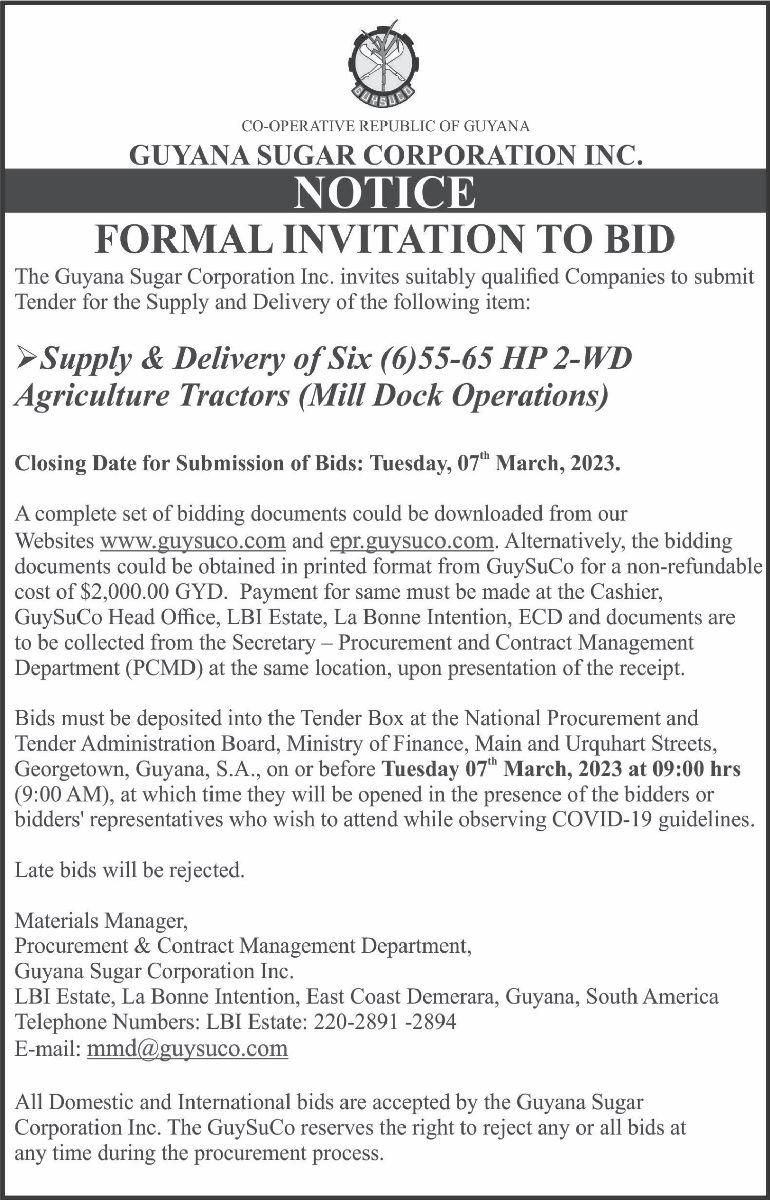 It was stated in the tender document that Investment Inc secured a $99,000,300 $150,000,000 each is estimated to continue contract to execute works for Phase Two of the repair of the roadways. The projects are the Canal No.1 road while Navin & Son slated to open on March 1, 2023 at the Construction was awarded a $ 93,181,410 National Procurement and Tender contracttoworkonPhaseTwoofCanalNo.2 AdministrationBoard(NPTAB)office. road.