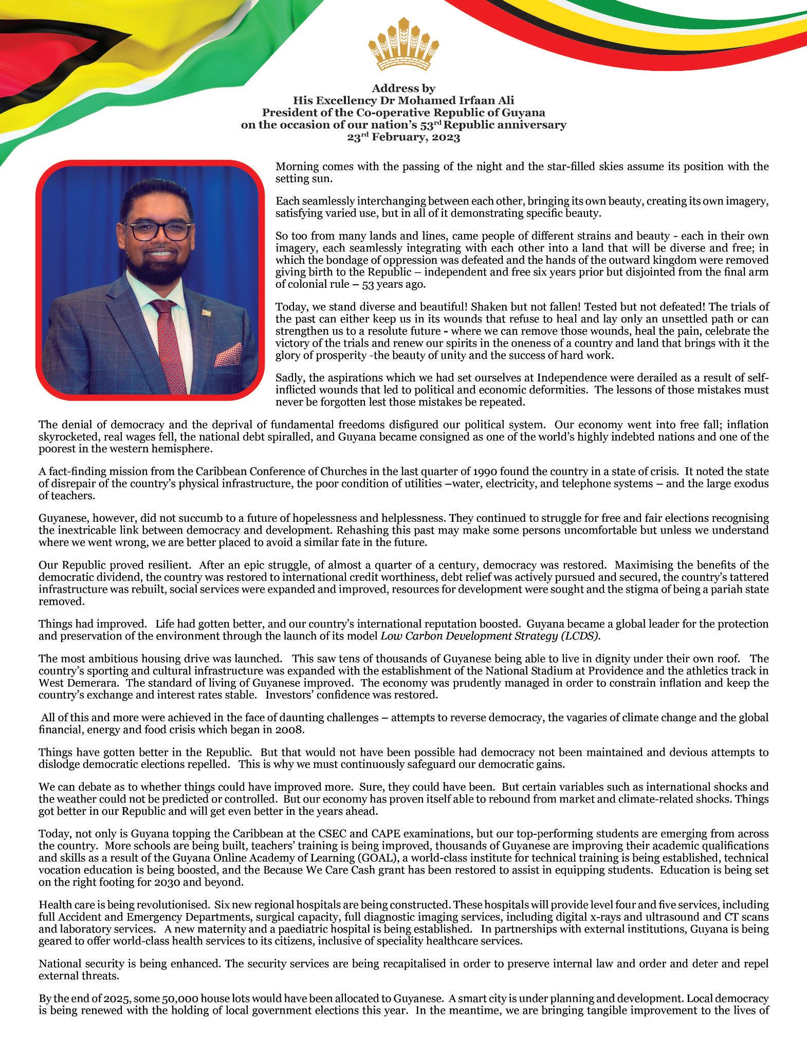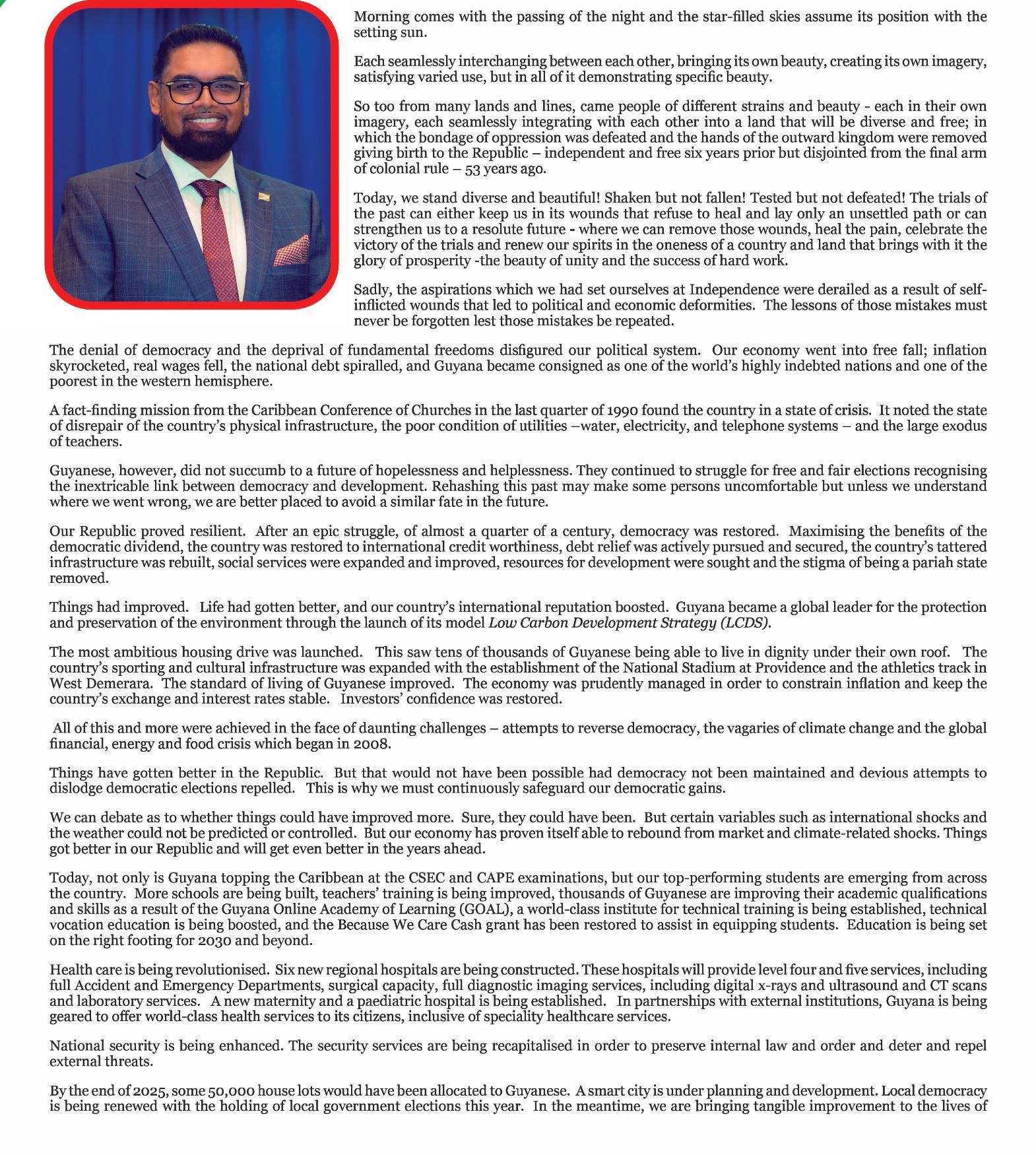 Byanymeasurement,GuyanaisayoungRepublic withmanypowerfulattributesitcanclaimasits own. Given our relative youth as a nation, and thevastnessofournaturalgifts,eachcitizenofthiscountry shouldbeamongtheenviedoftheworld. Whatshouldbe, and what is, are two different things, with the most regrettablegapexisting.