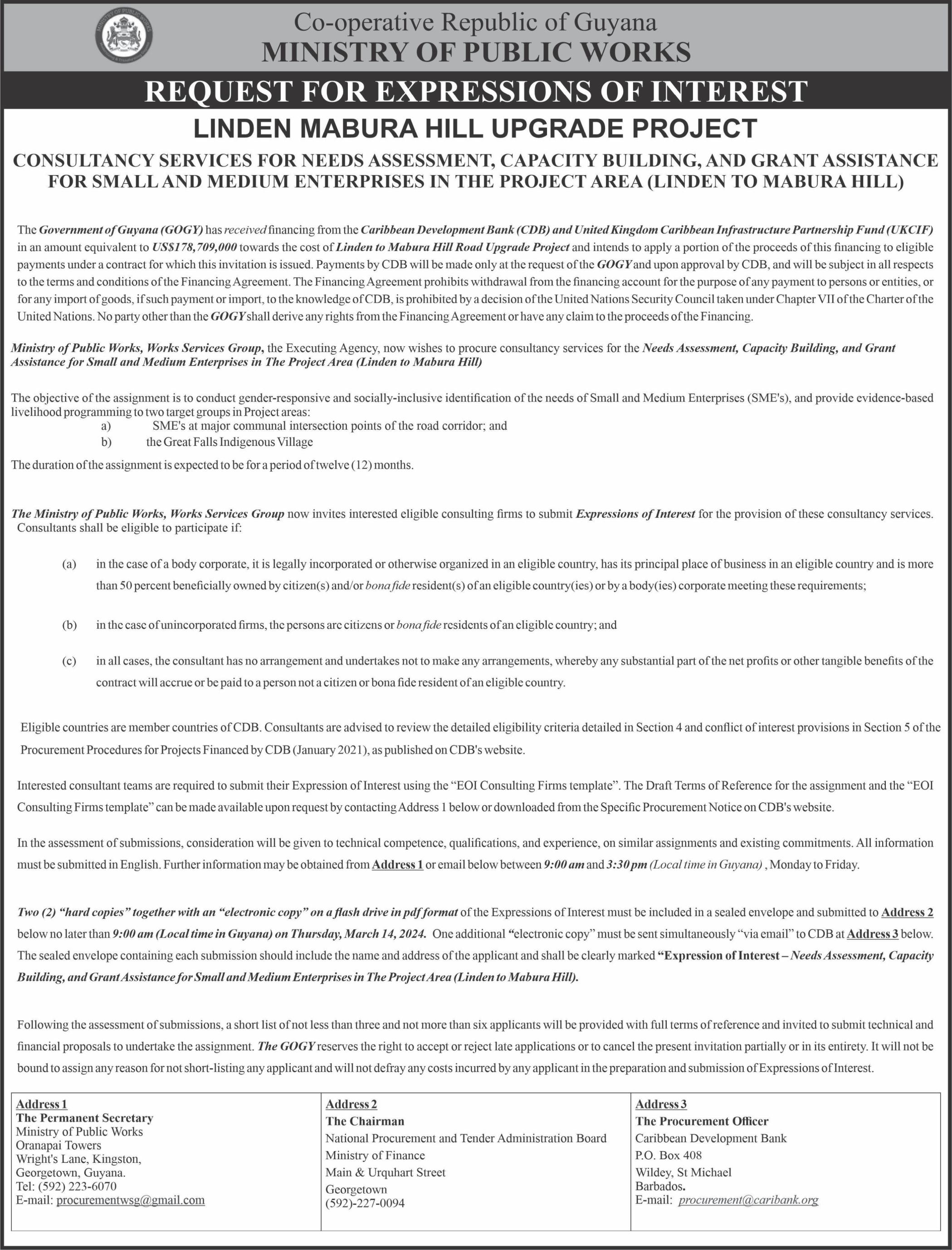 entity and is valued US$47,447. Barker, Barron and Law is among four entities that submitted bids for the Ministry of Natural Resourcesproject.