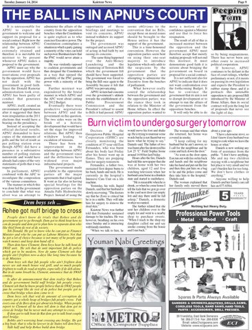 move a motion of noconfidence against a Minister and use that to force his resignation. The result of all of this is increased mistrust between the opposition and the government. APNU must therefore accept that merely making proposals will not end this mistrust. It must demonstrate good faith it is serious about bringing the government on board in proposal for a social contract. It is not sufficient also for APNU to indicate that it does not want confrontation over the forthcoming Budget. It has to convince the government that its aim is not to disrupt development or to attempt to run the affairs of the government from the opposition benches. It will only be able to do