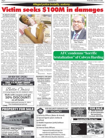 which we have sunk as a people. Colwyn Anthony Harding was arrested on the 15th day of November 2013 at a house in Timehri North. A party of policemen and members of the community-policing group visited the house he and his girlfriend were staying and kicked down the door. They claimed that he had stolen some articles from a resident. The group included an Inspector, Corporal Lowe and Constable Singh, who searched the house found nothing of evidential value. Constable Singh then said that he was going to bugger Harding and videotape it. Harding said that he was not a girl and there was no way in which he was going to let that happen. Singh then took his baton and hit Harding repeatedly until he fell unconscious. Harding regained consciousness in the Continued on page 12