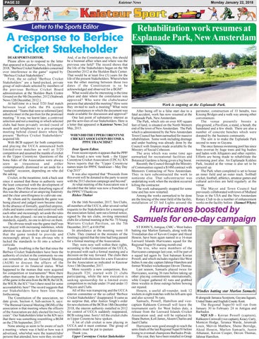 A response to Berbice Cricket Stakeholder DEAR SPORTS EDITOR, Please allow us to respond to the letter that appeared in Kaieteur News, 3rd January, 2018, “Berbice Cricket Stakeholders concerned over interference in the game” signed by “Berbice Cricket Stakeholders”. First, the so called “Berbice Cricket Stakeholders” are a hand-picked, private group of individuals selected by members of the previous Berbice Cricket Board administration at the Skeldon Back Centre Ground on the 9th December, 2012 (Stabroek News 12th December, 2012.). At half-time in a local T/20 final match between local clubs the PA system announced: “Teams that were so informed [are] asked to meet in the pavilion for the promised meeting.” It was, we learnt later, a contrived selection and not a meeting in which selected clubs had been privately invited (word of mouth and telephone) to a pre-arranged meeting behind closed doors where the present “Berbice Cricket Stakeholders” acquired life. With BCB support for both competition and playing the UCCA announced both limited-over matches as well as T/20 competition and assumed the mantle of cricket in the Upper Corentyne. Questions of the bona fides of the Association were always seen as treasonous and either contemptuously dismissed or set aside for a “suitable” occasion, depending on who did the asking. Cricket, in the meantime, took a back seat since it seemed that those in authority were the least concerned with the development of the game. One of the more disturbing signs of this was the absence of an umpiring fraternity and the clear unwillingness to cultivate one. By whom and by standards the game was being played and judged soon became clear. In the absence of formally, qualified umpires, clubs and teams connived and contrived with each other and increasingly set aside the rules to do as they pleased - no one to demand any standards, equally, no one to deliver on them. The obvious result was the game itself was now played with increasing indolence, while attention was drawn to the social festivities that the game tended to provide and increasingly attract. It was obvious why it lacked the standards to fit into a school’s curricula. Equally troubling is the fact that since the Berbice Cricket Stakeholders have been the authority of cricket in the community no one can remember an Annual General Meeting (AGM) to discuss the affairs of the association or its financial status. What happened to the monies that were acquired for competition or tournaments? Were there other monies that came for the development of the game in the area from the BCB, the GCB, the WICB, the ICC? Isn’t there need for some accountability here? The record suggests that our Stakeholders have been less than forthcoming. The Constitution of the association, no date given, Section 4, Sub-section b, says: “The Biennial General Meeting (BGM) of the association is that meeting where the officers of the Association are duly elected for two (2) years”. Our Stakeholders letter to the KN says that there was something resembling a BGM on the 27th September, 2017. None among us seem to be aware of such a meeting - where was it held or how was it advertised, who/what were the teams/clubs/ persons that attended, how were they invited?