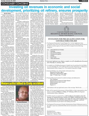 Motorcyclist killed in Craig accident A 47- year-old East Bank Demerara (EDB) resident met his demise on Friday around 23:45hrs while on his way home from work. The victim has been identified as Dhanraj Budhram of Lot 1380 Bellwest Housing Scheme W.B.D. At the time of the accident the victim was riding a motorcycle with registration number CJ5890. According to police sources, the other two vehicles that were involved in the accident are motor car PEE2203 which at the time was being driven 31year-old Leonard Juan, of Lot 9 Diamond, Junior Staff Compound, East Bank Demerara (EBD) and a car driven by 27year-old Quacy DeCunha of Lot 12 Supply, East Bank Demerara (EBD). Kaieteur News under-
