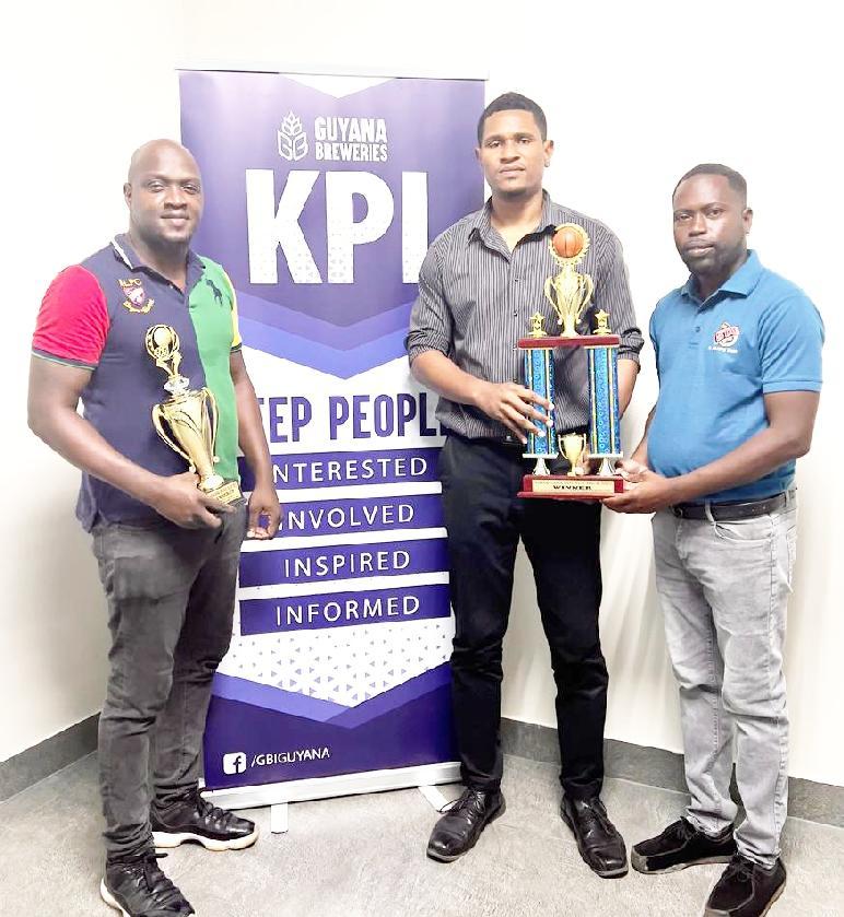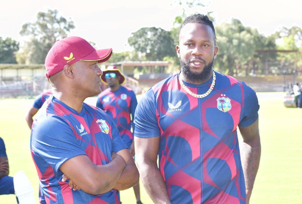 Castrol Strikers’Stephon Noah going for the ‘kill’ during his outstanding performance in his team’s win over GDF in the DVALeague. (Rawle Toney Photo) Devon Dover, GBI’s Trade Marketing Executive, making the presentation of trophies to GABApresident Jermaine Slater and LABApresident Rawle Toney. Brian Lara with Kyle Mayers during training. (CWI)