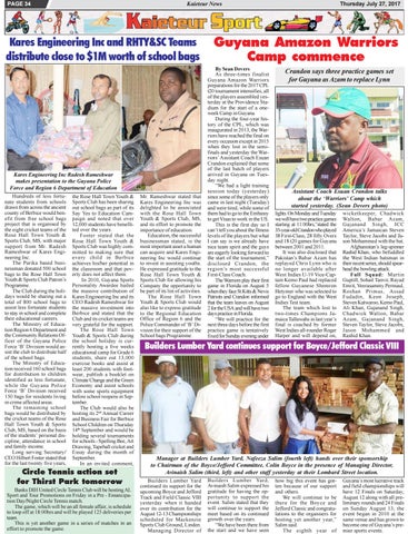Kares Engineering Inc Radesh Rameshwar makes presentation to the Guyana Police Force and Region 6 Department of Education Hundreds of less fortu- the Rose Hall Town Youth & nate students from schools Sports Club has been sharing drawn from across the ancient out school bags as part of its county of Berbice would ben- Say Yes to Education Camefit from free school bags paign and noted that over project that is organised by 12,000 students have benefitthe eight cricket teams of the ted over the years. Rose Hall Town Youth & Foster stated that the Sports Club, MS, with major Rose Hall Town Youth & support from Mr. Radesh Sports Club was highly comRameshwar of Kares Engi- mitted to making sure that neering Inc. every child in Berbice The Parika based busi- achieves his/her potential in nessman donated 500 school the classroom and that povbags to the Rose Hall Town erty does not affect them. Youth & Sports Club Patron’s In 2010, Guyana Sports Programme. Personality Awardee hailed The Club during the holi- the massive contribution of days would be sharing out a Kares Engineering Inc and its total of 800 school bags to CEO Radesh Rameshwar for assist less fortunate students the massive investment into to stay in school and complete Berbice and stated that the their educational careers. Club and its cricket teams are The Ministry of Educa- very grateful for the support. tion Region 6 Department and The Rose Hall Town the Community Relations Of- Youth & Sports Club during ficer of the Guyana Police the school holiday is curForce ‘B’ Division would as- rently hosting a five weeks sist the club to distribute half educational camp for Grade 6 of the school bags. students, share out 13,000 The Ministry of Educa- exercise books and assist at tion received 160 school bags least 200 students with footfor distribution to children wear, publish a booklet on identified as less fortunate, Climate Change and the Green while the Guyana Police Economy and assist schools Force ‘B’ Division received with some sports equipment 150 bags for residents living before school reopens in Sepin crime affected areas. tember. The remaining school The Club would also be bags would be distributed by hosting its 2nd Annual Career the cricket teams of the Rose and Business Fair for Berbice Hall Town Youth & Sports School Children on Thursday Club, MS, based on the basis 14th September and would be of the students’ personal dis- holding several tournaments cipline, attendance in school for schools - Spelling Bee, Art and family income. Drawing, Tapeball cricket and Long serving Secretary/ Essay during the month of CEO Hilbert Foster stated that September. for the last twenty five years, In an invited comment,