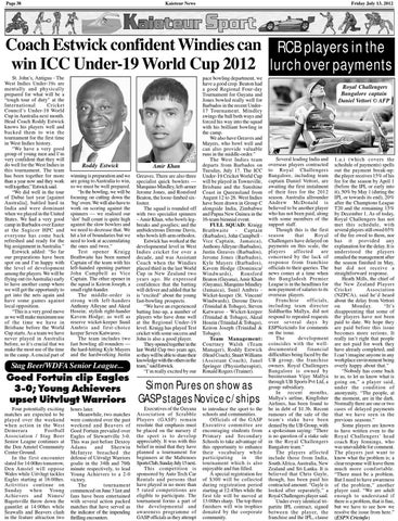 Coach Estwick confident Windies can RCB players in the win ICC Under-19 World Cup 2012 lurch over payments St. John’s, Antigua - The West Indies Under-19s are mentally and physically prepared for what will be a “tough tour of duty” at the International Cricket Council’s Under-19 World Cup in Australia next month. Head Coach Roddy Estwick knows his players well and backed them to win the tournament for the first time in West Indies history. “We have a very good group of young men and I’m very confident that they will do well for the West Indies in this tournament. The team has been together for more than a year now and they work well together,” Estwick said. “We did well in the tour of Dubai last year [against Australia], battled hard in India and were dominant when we played in the United States. We had a very good camp in Barbados over Easter at the Sagicor HPC and everyone has come back refreshed and ready for the big assignment in Australia.” Estwick added: “So far our preparations have been spot on and I’m happy with the level of development among the players. We will be flying out (to Australia) early to have another camp where we will get the opportunity to get into the nets again and have some games against local opposition. “This is a very good move as we will make maximum use of the time we have in Brisbane before the World Cup starts. As a team we have never played in Australia before, so it’s crucial that we make the most use of the time in the camp. A crucial part of