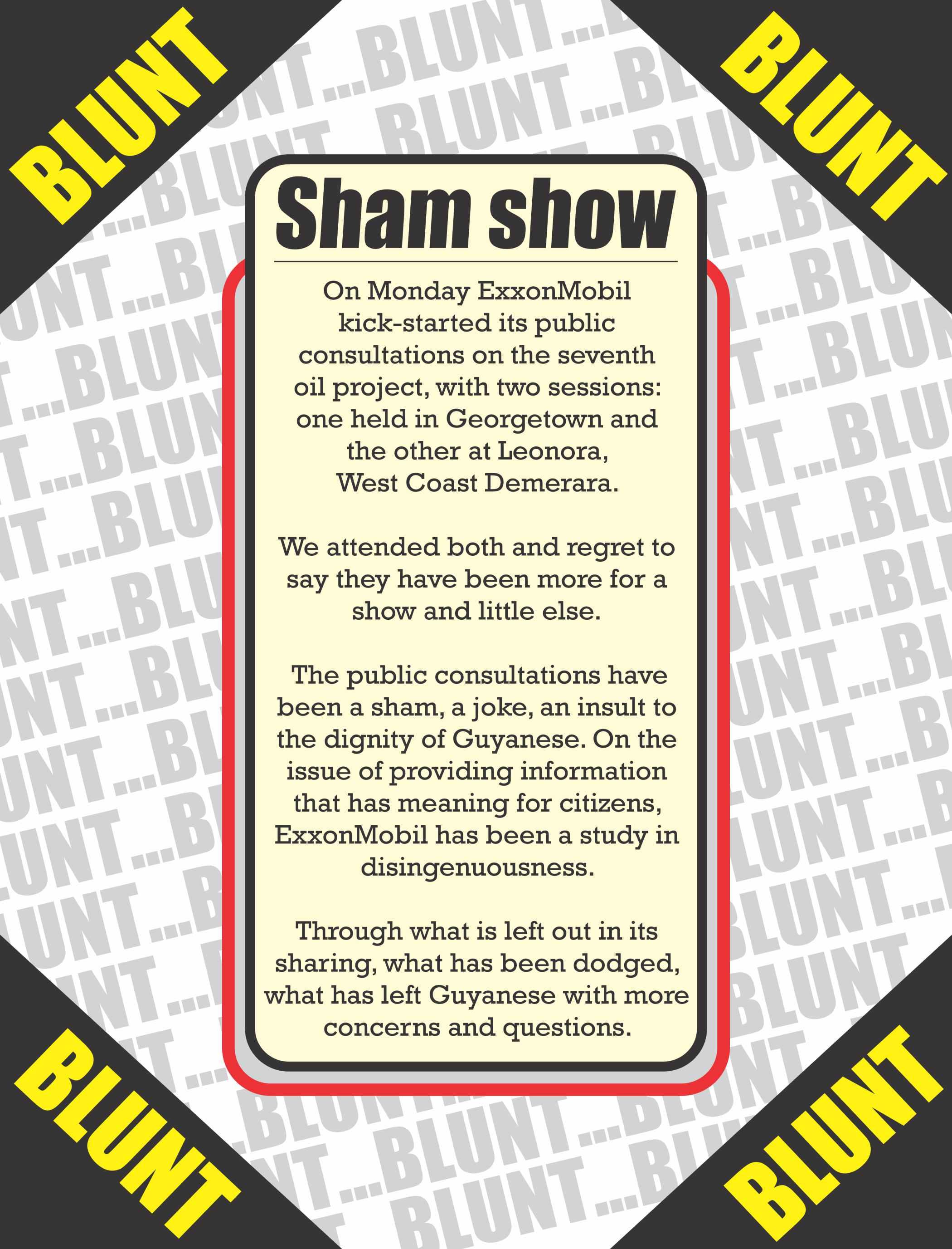 To date, we regret to say that ExxonMobil's public consultationshavebeenmoreforashowandlittleelse. The public consultations put on by ExxonMobil have been a sham, a joke, an insult to the dignity of Guyanese. On the issueofprovidinginformationthathasmeaningforcitizens, ExxonMobilhasbeenastudyindisingenuousness.