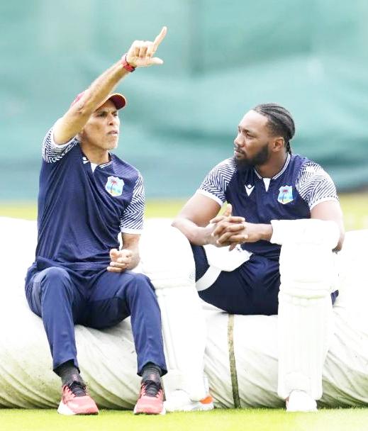 Jimmy Adams and Mikyle Louis chat during West Indies’practice session (PAPhotos/Getty Images)
