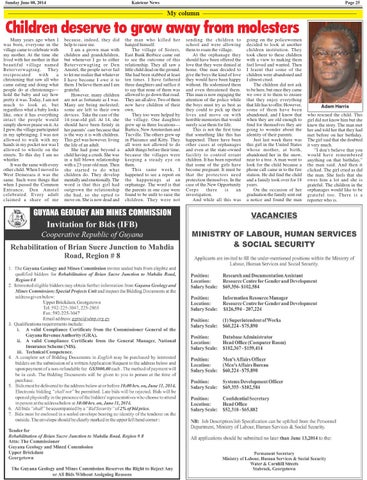 the man who killed her hanged himself. The village of Sisters, East Bank Berbice came out to see the outcome of this relationship. They all saw a little child dead on the ground. She had been stabbed at least ten times. I have fathered three daughters and suffice it to say that none of them was allowed to go down that road. They are all alive. Two of them now have children of their own. They too were helped by the village. One daughter grew up in three locations— Bartica, New Amsterdam and Tucville. The others grew up in Plaisance and Kitty. They all were not allowed to do adult things before their time, because the villages were keeping a steady eye on them. This same week, I happened to see a report on the happenings at an orphanage. The word is that the parents in one case were found to be unfit to raise the children. They were not