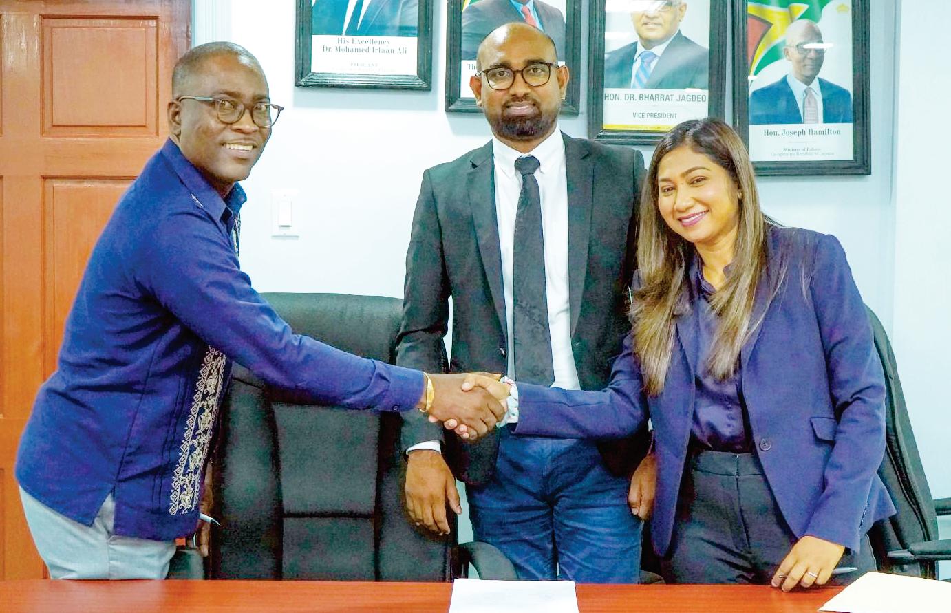 President of the Guyana Teachers' Union, Dr. Mark Lyte shakes hands with Permanent Secretary in the Ministry of Education, Shannielle Hoosein-Outar after the signing of the Terms of Resumption on Friday as another person looks on.