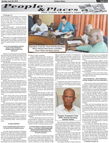 to Mexico and Panama, she is confident that the consortium has what it takes to successfully manage parking meters around the city streets. In the initial pilot phase, M&CC will be targeting a pilot project that will include South Road, Regent Street, Stabroek, Camp Street and Church Street that will see the creation of 1,500 parking spaces to be controlled by solar-power meters, Chase-Green disclosed. The consortium is reportedly promising to invest US$10M. According to Clarke, much of the controversy that has been swirling around has been unfounded and hearsay. SOLE SOURCING…DON’T DO WHAT WE DID – ROHEE TELLS GOVERNMENT Following the controversial allocation of a contract to implement parking meters to two companies without public tender, People’s Progressive Party (PPP) General Secretary, Clement Rohee, is warning the administration not to go down the same road as the PPP. He said this during the party’s weekly press conference Monday. When reminded, however, of the party’s track record in public procurement – notably the drug contracts which New Guyana Pharmaceutical Company (GPC) received without tenders - he made it clear that the PPP can still criticize the Government. ”Yeah, well, that (accusation) may have been leveled against us, but that’s the previous administration. But now they are in the Government and they have to face the music if they do it as well. That’s the nature of politics.” ”If you criticize the then administration, for not doing what you felt should have been done, and then now you get into government you doing the same which you had criticized the previous government on, then obviously it behooves the now opposition to criticize you for double standards.” ”You said you would not have done it, were you in the government. But you continue to do it now that you are in the government. Therefore we are not going to close our eyes; we are going to be similarly critical.” Saying that the party has been warning the current administration about going down the road of sole sourcing, Rohee stated that the contract should return to tendering. He described it as a case where the administration appears to be going full speed ahead on matters, oblivious to public (Continued on page 34)