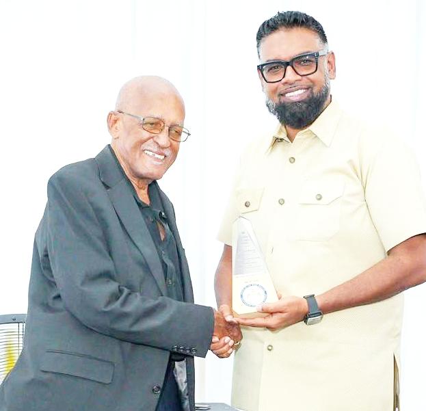 President Irfaan Ali presents the Lifetime Achievement Award to Ron Robinson.