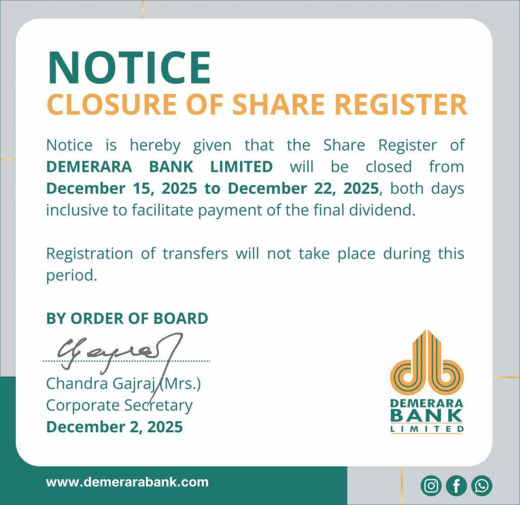 orDecember2,2025,aspossibledatesforthis meeting,”CGXsaid.Itremainsunclearwhether this meeting was held. Kaieteur News on Wednesday contacted Minister of Natural Resources Vickram Bharrat for an update, but uptopresstimenonewasreceived.
