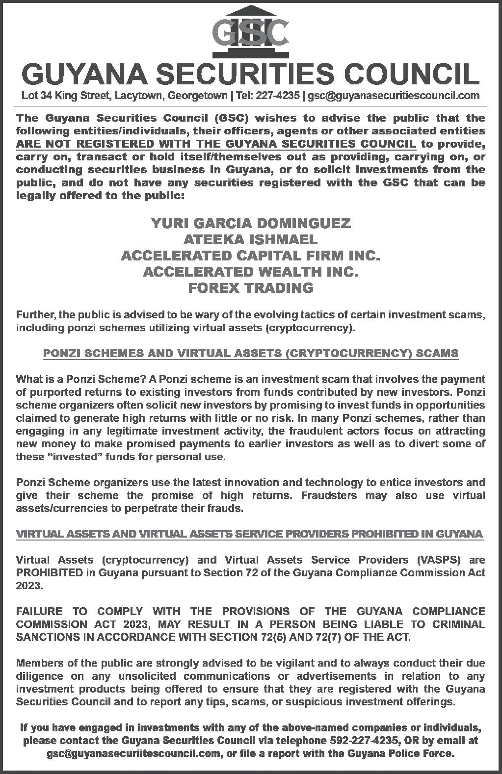 Notably, Attorney General and Minister of Legal Affairs Anil Nandlall, S.C. recently disclosed thattheGuyanaPoliceForce(GPF) andtheGuyanaRevenueAuthority (GRA) believe they have gathered enough evidence to proceed with actions concerning the sanctions imposed on Nazar Mohamed and his son, Azruddin Mohamed, as wellasPermanentSecretaryofthe MinistryofLabour,MaeThomas. Vice President Bharrat Jagdeo, at his recent press conference, had noted that this is just the tip of the iceberg regarding the Mohameds. Nazar Mohamed had accused the members of the government of misrepresenting the sanctions to stiflehisbusiness.