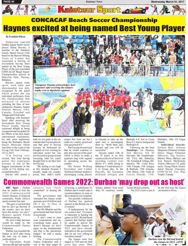 Haynes excited at being named Best Young Player By Franklin Wilson Twenty-one year-old Golden Jaguar beach soccer player Jamal Haynes, a member of the Attention Family Beach Soccer Club based in the Bauxite Mining To w n o f L i n d e n h a s expressed a feeling of excitement having been named as the Best Young Player at the just concluded CONCACAF Beach Soccer Championship played at Malcolm Park, Nassau, Bahamas. Haynes’ speed, team spirit, work ethic and showmanship was duly recognised by the panel which picked the top individual performers from the championship that attracted 16 nations including the likes of new champions Panama, beaten finalists Mexico, USA, C a n a d a , Tr i n i d a d a n d Tobago and El Salvador. Speaking with Kaieteur Sport after receiving the Scotiabank Best Young Player trophy, Haynes expressed delight at being recognized and rewarded for his efforts at his first major international tournament, his only prior experience being the Barbados Beach Soccer Showcase which was held in the Land of the Flying Fish from February 10-12, 2017. ”I’m feeling very excited, first time having gotten this experience oversees in one of the biggest tournaments in the world, so I’m feeling very excited about this.” Haynes who scored a