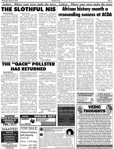 Trust. ACDA would like to acknowledge Mr. Terrence Campbell (CAMEX Inc); Mr. D e r r i c k C u m m i n g s (SBB); Ms.Glenyss AdamsJames (Commonwealth Yo u t h S e c r e t a r i a t ) ; D r. James Rose (Director of C u l t u r e ) ; M r. R o b e r t Persaud MP (Minister of Natural Resources); Ms. Vi o l e t Jean-Baptiste (ACDA) AND Mr. Nigel Johnson (NIGELS) for financial help for this endeavour. This will be an annual event every African History Month. The third major activity in ACDA for African History Month was the visiting of schools to assist them in their own activities. ACDA visited the Berbice Multilateral School in New Amsterdam and participated in the very colourful North Georgetown Secondary School sixth Annual Culture Day. Apart from this, ACDA v i s i t e d t h e St . J o h n ’s Golden Jubilee Club comprised of seniors at their request and later hosted them at the AKWAABA centre for a Lecture Tour. These 16 women are all above 65 years of age and meet every Wednesday to keep each other companies in well-structured activities. Eric Phillips