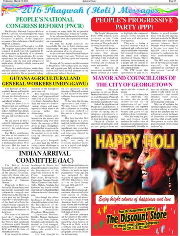 we are optimistic as the message of Phagwah reminds us, that success in the future will come from our principled struggles. At this time, the Guyana Agricultural and General Workers Union (GAWU) takes pleasure in wishing all Hindus, indeed all Guyanese a Happy Holi 2016. That fact that this Holi festival appeals to a cross sector of our diverse religious and cultural makeup is significant. Any event that can promote togetherness and tolerance should be encouraged. In the circumstances of t o d a y, o u r u n i t y t o overcome injustices and so on to a joyful and bright future is essential.
