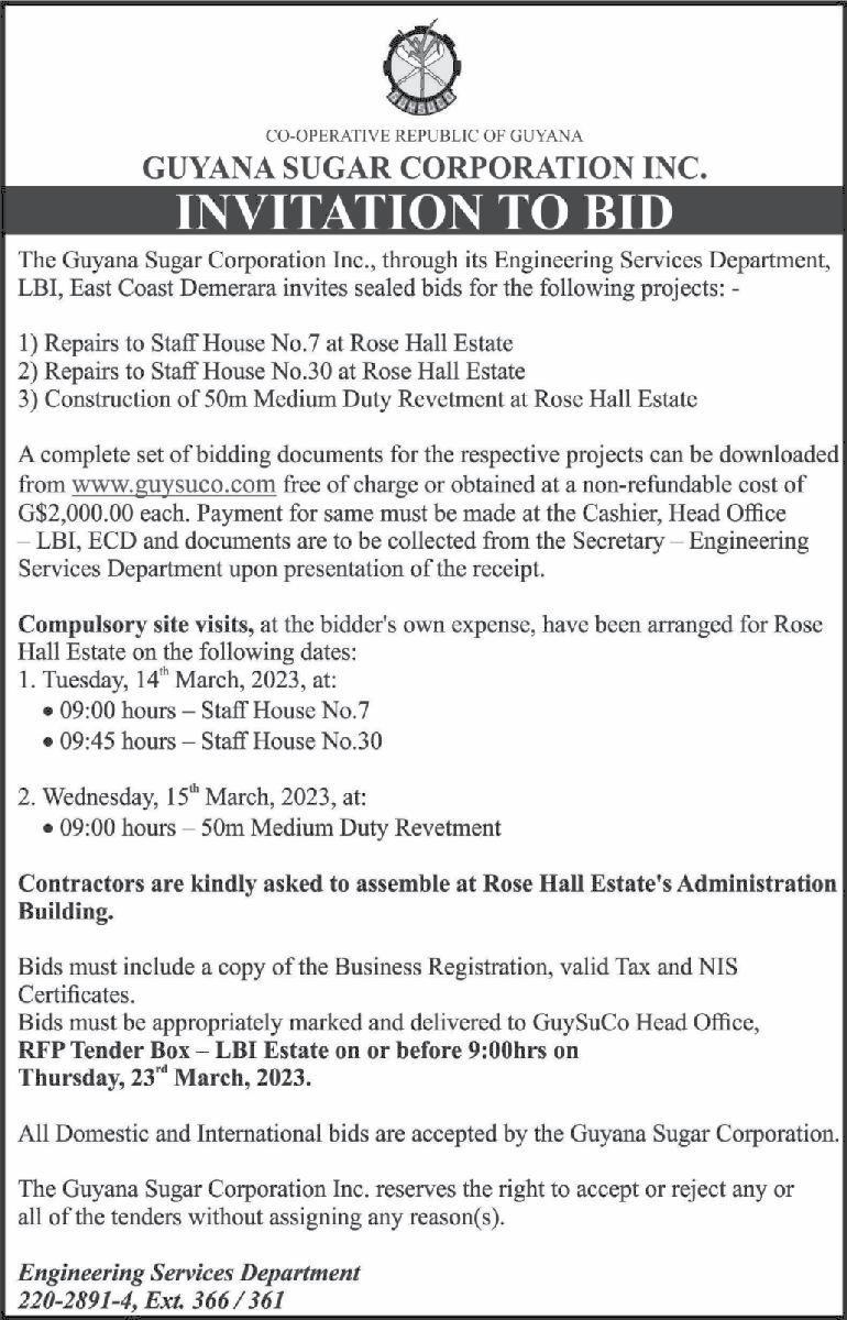 According to an wasstatedinthead. advertisement in Kaieteur Notably, bids must be News March 12th edition, addressed, to the Chairman the Government intends to at the National Procurement apply part of the forest fund and Tender Administration p r o c e e d s t o w a r d s Board (NPTAB) and placed purchasing three motor in the tender box before vehicles. It was stated that 09:00hrs on April 18, 2023. the procurement will be Kaieteur News had reported done pursuant to the Bank’s thatthedealwassigned Policies by the Guyana (Continued on page 9)