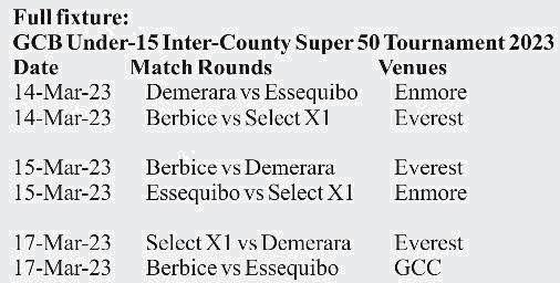 The Guyana Cricket Lakeram Singh, Gibran Crossman, Jacthniel Nurse, Board (GCB) announced the Yacoob, Reshan Sakrulla, Eldon Lewis, Bhomesh Lall, commencement of the GCB FeaazBaksh Christopher Williams, Under-15 Inter- County Zandon Rose, Nicholas Demerara squad: tournament, which is set to Lovell, Vierindra Pooran, Mickel Sharma (Captain), bowl off today, March 14. Justin Dowlin, Jonathan