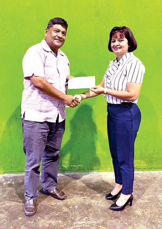 Assistant Secretary of the Guyana Olympic Association, Emelia Ramdhani, hands over sponsorship cheque to Robert Singh, Treasurer and Director of Archery Guyana.