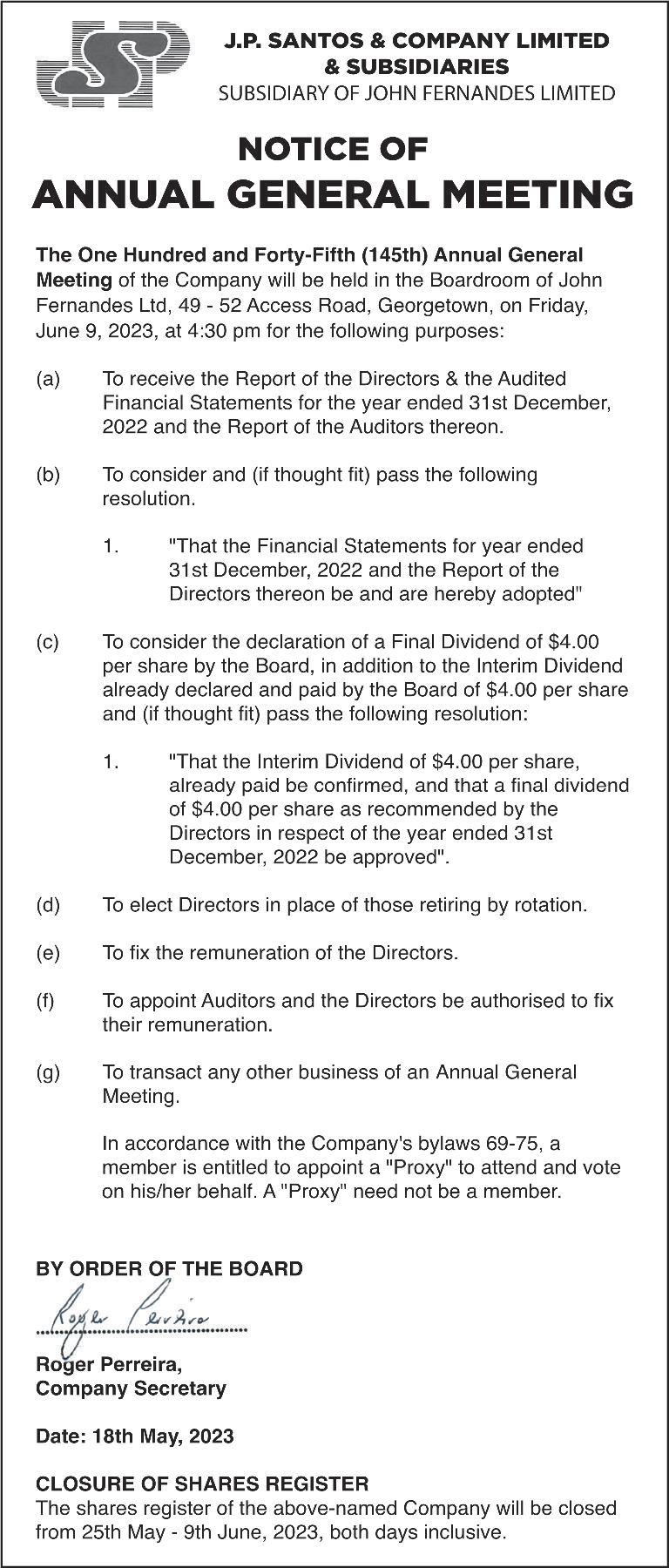 The group believes that insurance coverage to the international petroleum effectsstillpending.” the judgment is a serious safeguard Guyana against industry.” Taking the foregoing cause for concern as it has the “grave potential danger The group further noted, pointsintoconsideration,the ordered the provision of an and consequences to the “For the company to g r o u p c a l l e d f o r unlimited parent guarantee State and citizens” of an oil provide an unlimited shareholders to vote for its for oil spill operations spill. Failure to comply with P a r e n t C o m p a n y proposal on May 31, 2023 at offshoreGuyana. the court order would result