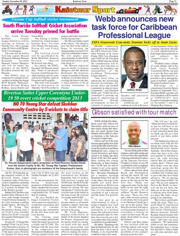 Vivian Khan. The batting is further fortified by wicket-keeper/ batsman R a v i P e r s a u d (OJ), Randy Narainasami, N a z i m A l i a n d Vi s h a l Singh. The bowling attack will be spearheaded by Mark Mukhlall, Ramesh Persaud, Masood Mohamed and others. In a release, the SFSCL President Sal Hussain stated that, “Some of our players have not visited Guyana for a while and upon arrival, some will travel to Berbice, parts of Demerara and Essequibo. The team will assemble back in Georgetown on Thursday 7th of November to