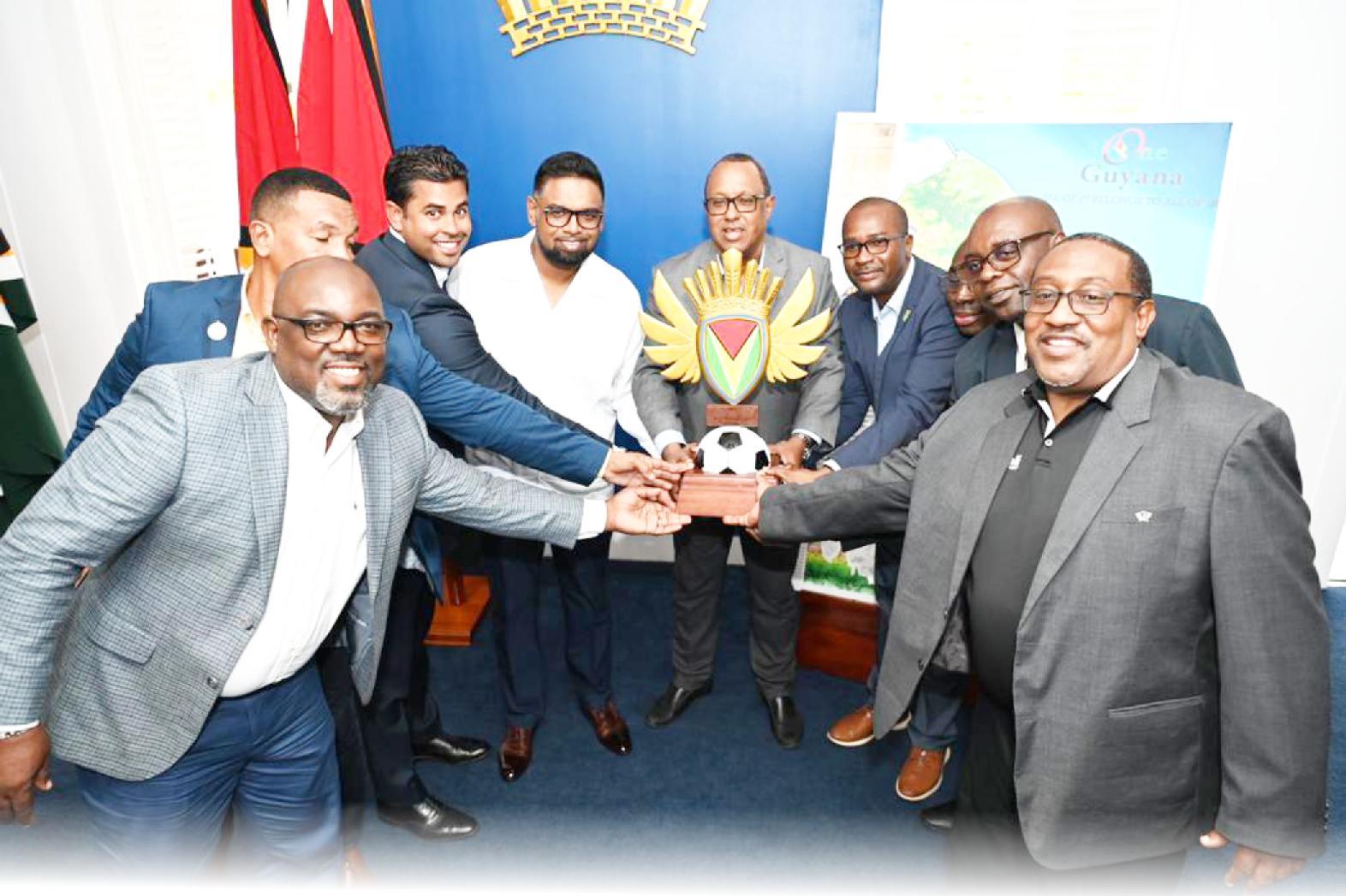 “OneGuyanaisnotonly about unifying people, it is how do we bring together all dimensions of our society into building a One Guyana, one country, and sport is an important part of that,” President Ali said yesterday on the sidelines of his meeting with football stakeholders at State House, regarding the inaugural tournament The One G u y a n a F o o t b a l l Tournament trophy was also handed over to PresidentAli by the BrassAluminium and Cast Iron Foundry Ltd (BACIF)ManagingDirector Peter Pompey The tournament which will be administered by the Guyana Football Federation (GFF), will kick off with an inter ward competition in all 10 Regions.