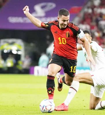 Morocco’s Romain Saiss, right, fi the ball with Belgium’s Eden Haza the World Cup (AP Photo/Alessandra