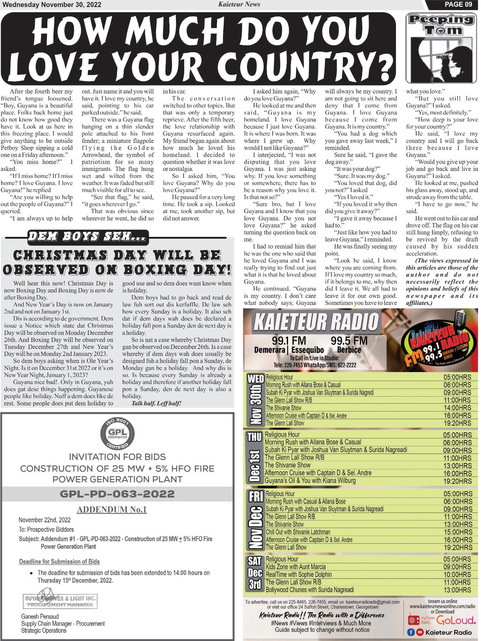 DEAREDITOR, describe centuries ago as the irksome is that for all of this their leaders should always The old folks say “you divinerightofKings. year, the cost of living has b e n e f i t f r o m t h e i r nah see thing a daytime T h e p r o b l e m i s been going up week by experiences. With fanfare and tek firestick fuh see it exacerbated by a group of week However, knowing this year, we welcomed with night time,” simply means Cabinet Members, Advisors the proclivity of sections of great joy the new King of to be mindful of the signs and others with one or two the Guyanese community to England,CharlesIII. thatsurroundyou.Whenyou exceptions who see nothing splurge at Christmas, this It may be helpful if we areabletoseeclearwarnings wrong with this march to announcement and payout is recount as part of our about a situation, you should leadingaKingdom,ignoring conveniently timed for education, the first King heed them, instead of the norms of protocol, our Christmas2022. Charles I. King Charles I ignoring them, as ignoring Constitutionandworstofall, The main beneficiaries believedintheDivineRights them might bring you pain our cherished belief in of the back pay will be the of Kings and that they anddisaster consultation. merchants, who bring in all answered to God for their Observations below Last week, the President sorts of stuff to help public actions and not to their points in this direction, but announced an across the servants enjoy, and I subjects. first a saving grace are the board increase to Public emphasize enjoy Christmas, This allowed King erudite Editorials in the Sector employees of 8%. At and I say to the public Charles to ignore Parliament independent media such as thetime,Iwassomedistance servants, avoid a shopping and the Institutions, which the Kaieteur News and away from my radio and I spree, practice deferred kepttheKingdomintact.His Stabroek News helping to thought I heard an across the gratification and not for fateishistory focus the search light to board increase of 38%. It v i c t i m s t o a w e l l Centuries later in pierce darkness are the likes was 8%, but the quantum is orchestrated plan to keep Guyana, we see a revival of of Village Voice, Channels 6 not relevant for the purposes some of us at the bottom of those beliefs, where the and9. ofthisletter theladder Head-of-State can ignore all