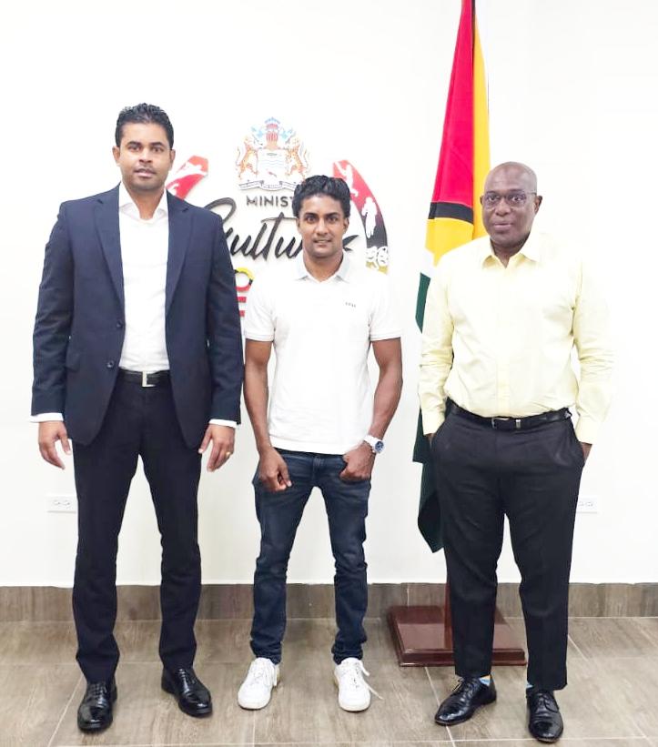Elton ‘Coolie Bully’Dharry (centre) is flanked by Minister Charles Ramson Jnr. (left) and Director of Sport Steve Ninvalle.