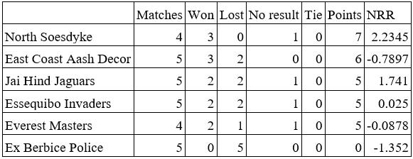 Everest Masters is currently locked on 5 points with Jai Hind Jaguars & EssequiboInvadersbutliein 5th place on the points standing due to its inferior NRR.