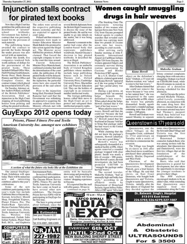 Injunction stalls contract Women caught smuggling drugs in hair weaves for pirated text books Now that a High Court has prohibited the publication and distribution of “pirated” school textbooks, Government has halted a contract that was previously issued for the provision of such material. The publishing house awarded the contract to provide the books through the tender process was also served with an injunction. Earlier this month, five companies tendered bids worth millions of dollars for the procurement of the pirated books. These included Giftland Office Max, F&H Printing Establishment, Pavnic Press, Sheik Hassan Printery and Metro Office and Computer Centre; the contract winner which placed the lowest bid of $103,671,162. On Tuesday, Attorney-atlaw Andrew Pollard, on behalf of the British Publishers’ Association, filed an injunction in the High Court stopping all local publishing houses from printing and selling the pirated textbooks.
