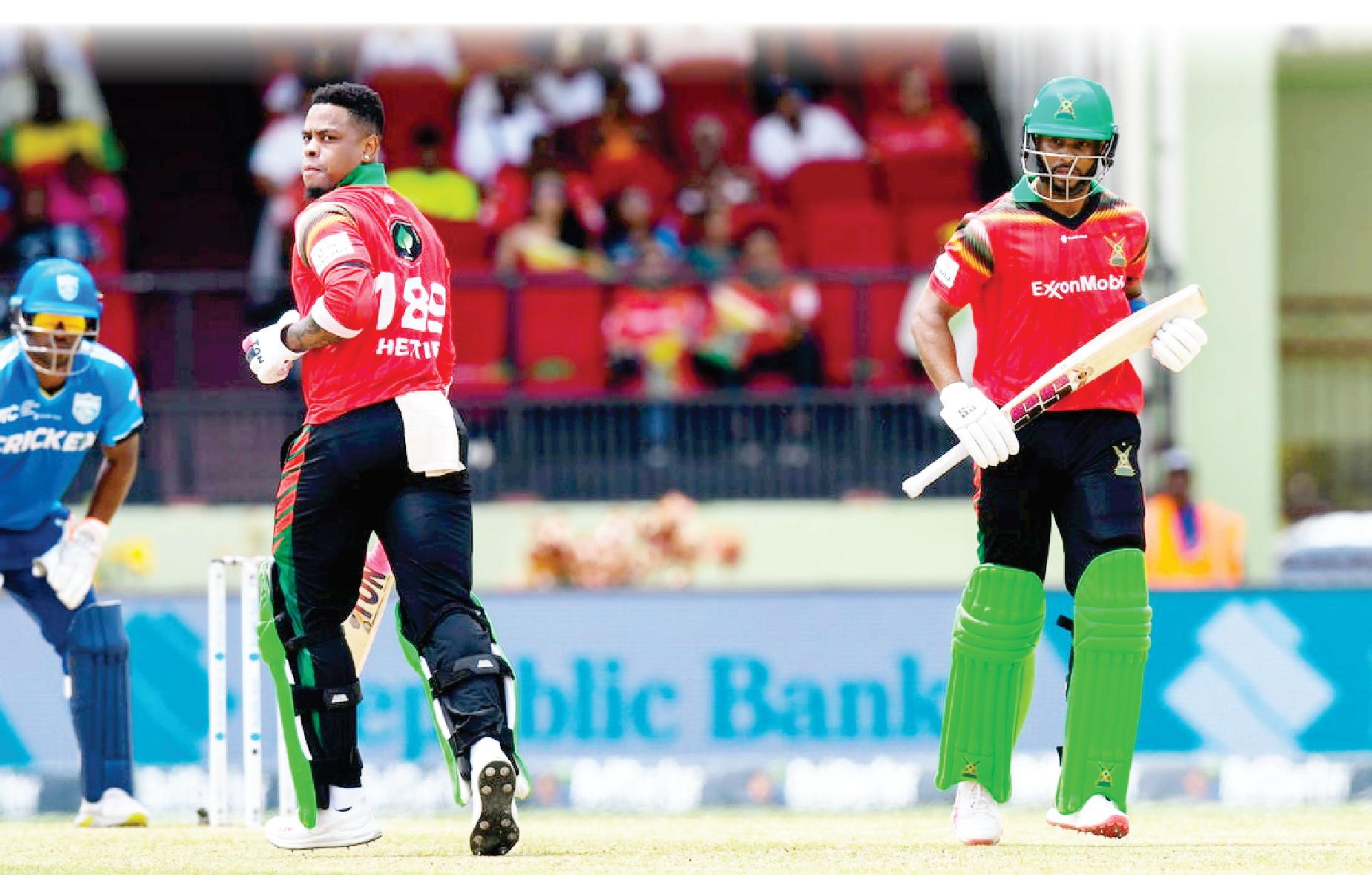 It was a clinical 35-run Hetmyer and Hope replayed fours, racing to 56 off 31 balls to likesofWieseandAhamd. Motie (2-27), Imran Tahir (2-17), trouncing at the hands of the their innings from the previous complete his second successive All-rounder Romario Shepherd Mooen Ali (2-20) and Junior Guyana Amazon Warriors, who game, adding 85 runs for the 3rd half-century kept his moniker as finisher alive, Sinclair (1-31) were magical as made light work of the number one wicket which inevitably propelled The Guyanese left-hander and romping to 24 off 16 with three usual, ensuring that apart from du ranked St. Lucia Kings thanks to theWarriorsto207-7after20overs match MVP Hetmyer, the Warriors fours, helping his team over the Plessis, only Johnson Charles (12), fifties from Shimron Hetmyer and expired. leading scorer, maintained his 200-runmark. Ackeem Auguste (12) and Wiese Shai Hope, coupled with 6 wickets Fast-bowlersAlzarri Joseph (2- immaculate form by smashing 9 The Warriors star-studded (14)madeittodoublefigures. from their spinners, yesterday, at 39) and David Wiese (3-43) fours and a six on his way to 58 bowling attack then feasted on the Joseph returned to partner a Providence in the 2024 Republic alongside leading wicket-taker in fromjust30deliveries. Kings batsmen, minus Captain Faf cramp-ridden du Plessis after a BankCaribbeanPremierLeague. spinner Noor Ahmad (2-26), kept Amazon Warriors openers du Plessis, who carried his bat deep dramatic collapse, scoring 25 not Thechampssurgedtothetopof theKingsbowlingtogether Azam Khan (26) and Rahmanullah into the innings with a classy, outwithafourandtwomaximums; the points table ahead of tonight’s After finding form recently, Gurbaz(26)setthetoneforGuyana unbeaten 59-ball 92* (7x4 5 x 6), ending as the last men standing grand battle against Trinbago Hope continued his batting uprise as they matched each other shot for easilymissingoutonaton. following a spellbinding show by KnightRiders(TKR). by hitting five sixes and a pair of shot before losing their way to the Left-arm spinner Gudakesh theWarriorsspinners.(C.Ross)