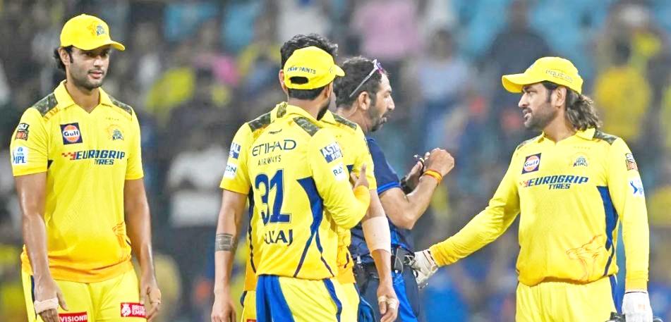 MS Dhoni and his team-mates have a chat with umpire Anil Chaudhary, Lucknow Super Giants vs Chennai Super Kings, IPL 2024, Lucknow, April 19, 2024. (AFP/Getty Images)
