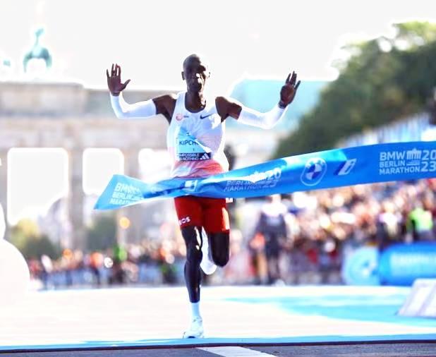 Kenya's Eliud Kipchoge crosses the finish line to win the Berlin Marathon.