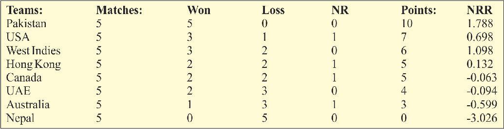 The West Indians faced bowlingattack. (29 off 40 balls) and Junaid Canada lost both its openers wicket stand with Jan Nisar Points standing after 5 l i t t l e p r o b l e m s i n Hosts Pakistan has Khalil Nainitalwala (31 off cheaply Theaskingratekept Khan (52 off 74 balls) to roundsofexcitingcricket: overcoming the winless virtually booked a place in Nepal. Put into bat by the the semifinals by having Windies, Nepal kept losing won their first five matches, wickets regularly at one end earning them full 10 points. while opener Rabin Joshi USA has moved to second waged a lone battle against place in table with seven the bowlers. He made 97 off points, closely followed by 136 balls but lack of support West Indies having six from his colleagues didn’t points. allow them to post a Next on the list are Hong respectable total and they Kong and Canada with five hadtosettlewithabelow-par points each while Australia