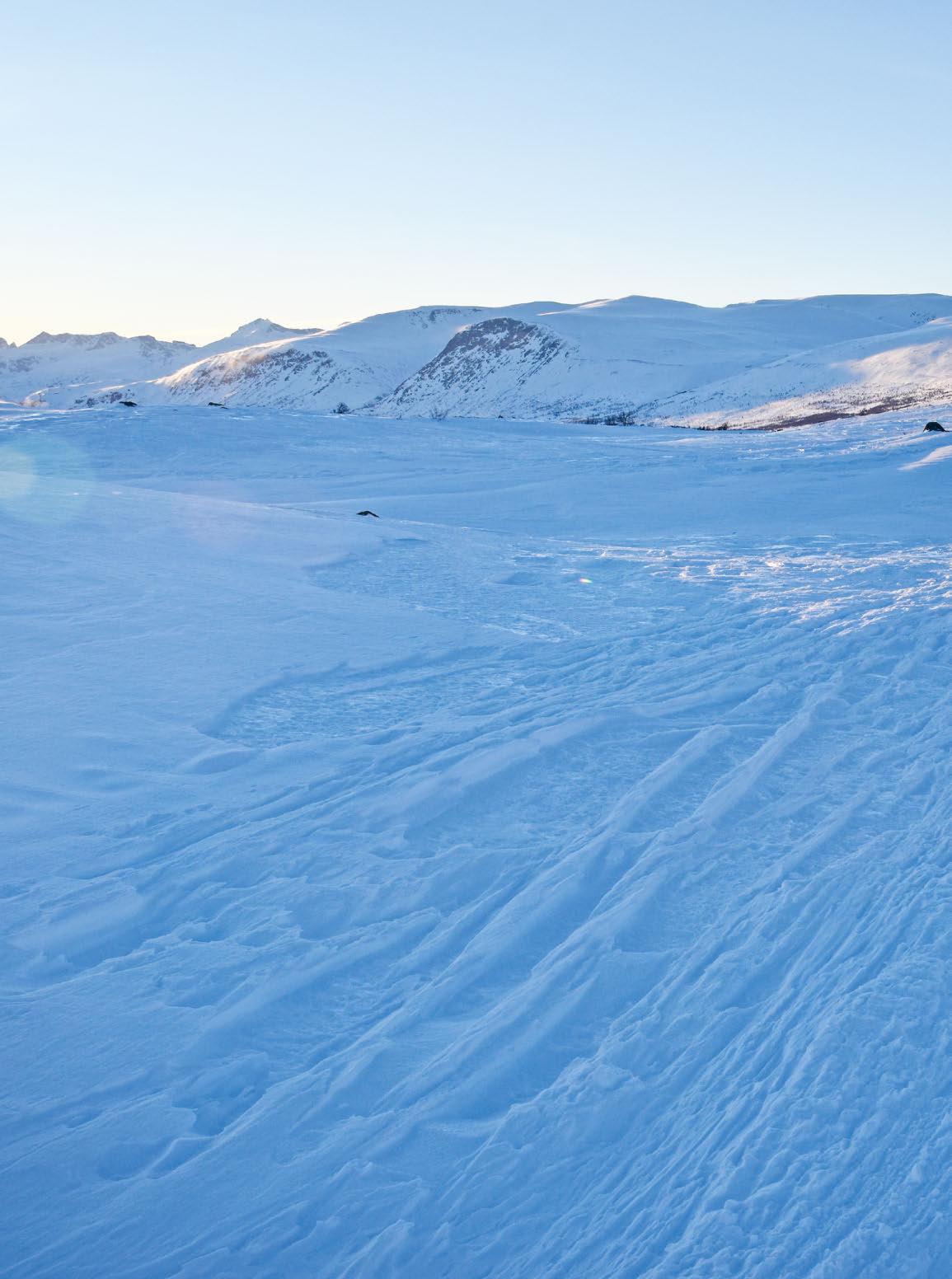 trolig er over 200 år gammel. Vi hilser på drengen, som er her for å klargjøre hovedhytta til påske. Hytta er populær blant toppturentusiaster, og både Snota (1668 moh.) og Trollhøtta (1614 moh.) er fine dagsturmål. Vi er i Svartåmoen naturreservat i hjertet av Trollheimen. Området består av nærmest urørt og urskogpreget furuskog. Skiløypa går langs østsiden av elva Folda, som blir stadig bredere etter hvert som vi nærmer oss Gråsjøen. Det har vært en mild vinter, og elva bruser friskt. Bjørketrærne er pyntet med hengende busklav. Vintermerkingen er blå trestykker festet til trærne. Værbitte og vridde furugadder lyser grå og vennlige mot oss da vi labber oppover. Snart forlater vi den gamle furuskogen og møter kvistene øverst i skaret nedenfor Kvernabekkvatnet (792 moh.).