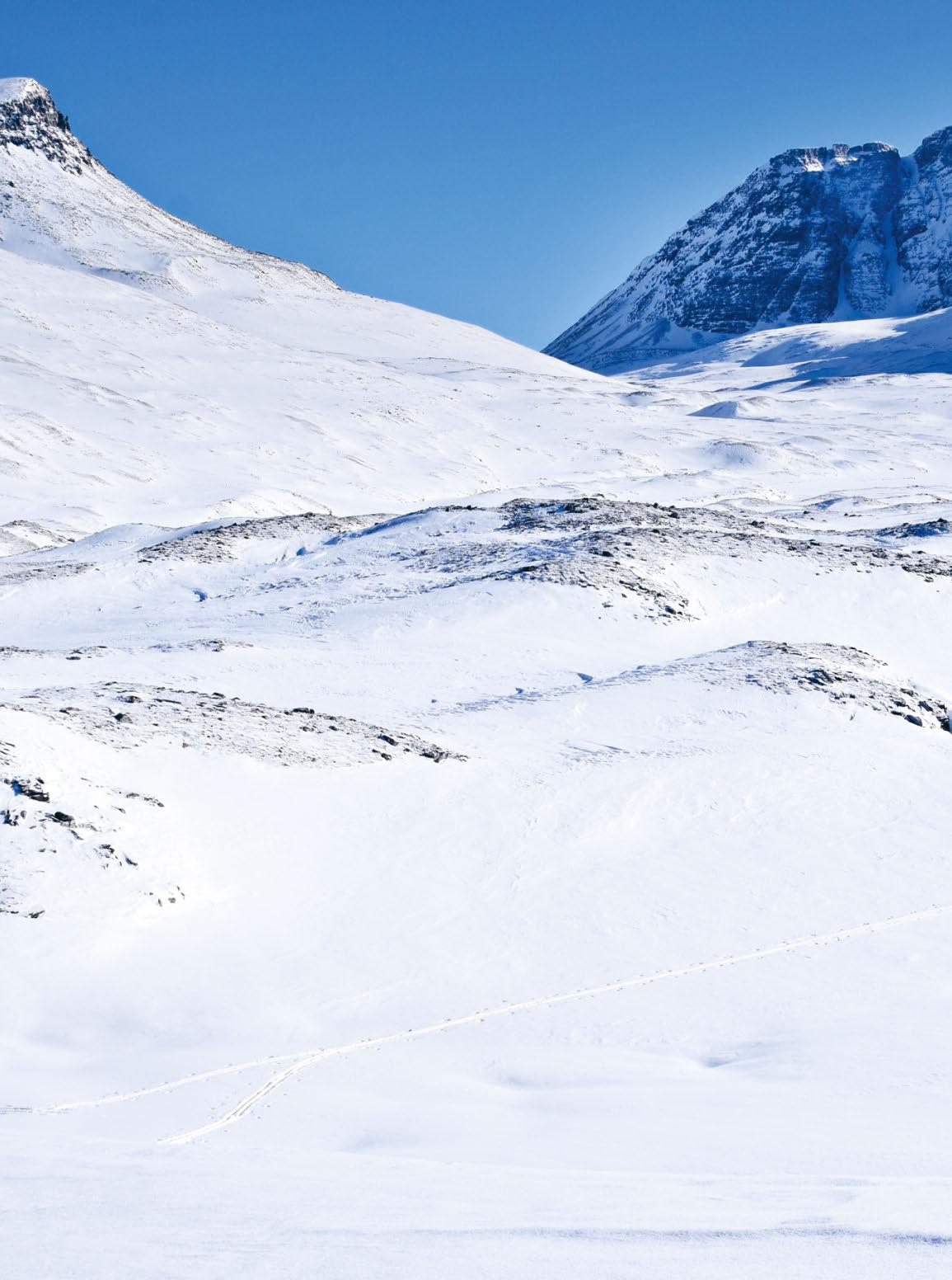 Skiløypa går på baksiden av det mektige Trollhøttamassivet (1614 moh.) og følger en rekke fjellvann østover i dalen nedenfor Rindhatten (1335 moh.). Svartådalen er rasfarlig om vinteren. Føret er sugende, og vinden blåser ubarmhjertig. Vi bytter på å gå først i rekken, for innimellom forsvinner skiene i knedyp snø. Humøret synker sammen med lufttemperaturen da vi stiger opp i høyden. Der venter en steinhard, blåaktig porselensskorpe med is som selv stålkantene sliter med å få feste på. Sikten er minimal. Jeg blir nesten sjøsyk av å gå i det konturløse landskapet med bølger av snø som driver bortetter bakken. Vi ser noen grå skygger som kommer nærmere. Folk! De strever seg fremover, godt inntullet i hetter og skjerf. Vi slår av en prat, men det er ikke så lett å høre hverandre under alle lagene med hodeklær. Snart starter nedkjøringen mot Jøldalshytta (740 moh.). Det
