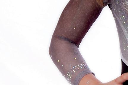 Maillot con mangas largas, cuello cerrado y hombros abiertos con combinación de: Lycra Lisa Sublimada Lycra Cristal Sublimada con Brillantes AB