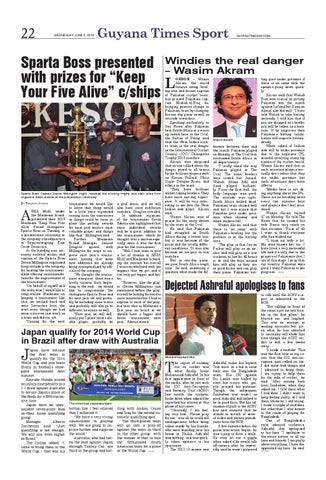 ting goes under pressure if there is an issue with the openers going down quickly.” Akram said that Wahab Riaz was crucial in getting Pakistan win the match against Ireland but Kamran Akmal also did well. “I have told Wahab to take batting seriously. I told him that if you are dropped as a bowler you will be taken as a batsman. If he improves then Pakistan’s batting combination will improve tremendously. When asked if Indian side will be under pressure due to the explosive IPL scandal involving many big names of the cricket world, Wasim Akram said that in such situation players normally don’t admit that they are under pressure but such situations does have affects. “Media here is not doing anything about the IPL. There are no breaking news every two minutes here and players don’t feel pressured.” Wasim Akram turned 47 on Monday. He told The News that he missed his wife Huma very much on this occasion. “First of all I want to thank everyone who has wished me. “I miss my wife a lot. My sons misses her too. I have lived a very successful life and it’s only due to the prayers of Pakistanis that I am at this stage. I pray that my country Pakistan does good. I want Pakistan to see progress.” (WICB)