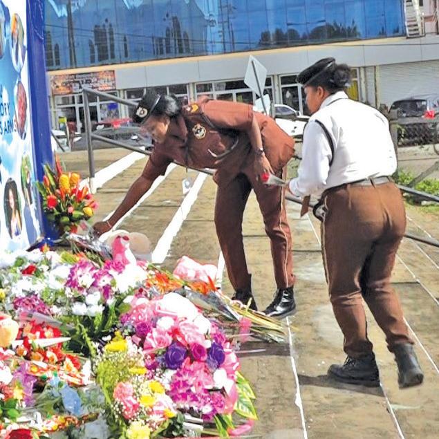 The Head of State and Members of his Cabinet, along with Members of the Diplomatic Community, on Wednesday flew into Mahdia, where they joined residents there for a flower-laying ceremony at the site of the Mahdia Secondary School’s dormitory, where 18 females between the ages of 12 and 17, and one five-yearold boy – the son of the dorm parents – lost their lives in Sunday’s fire.