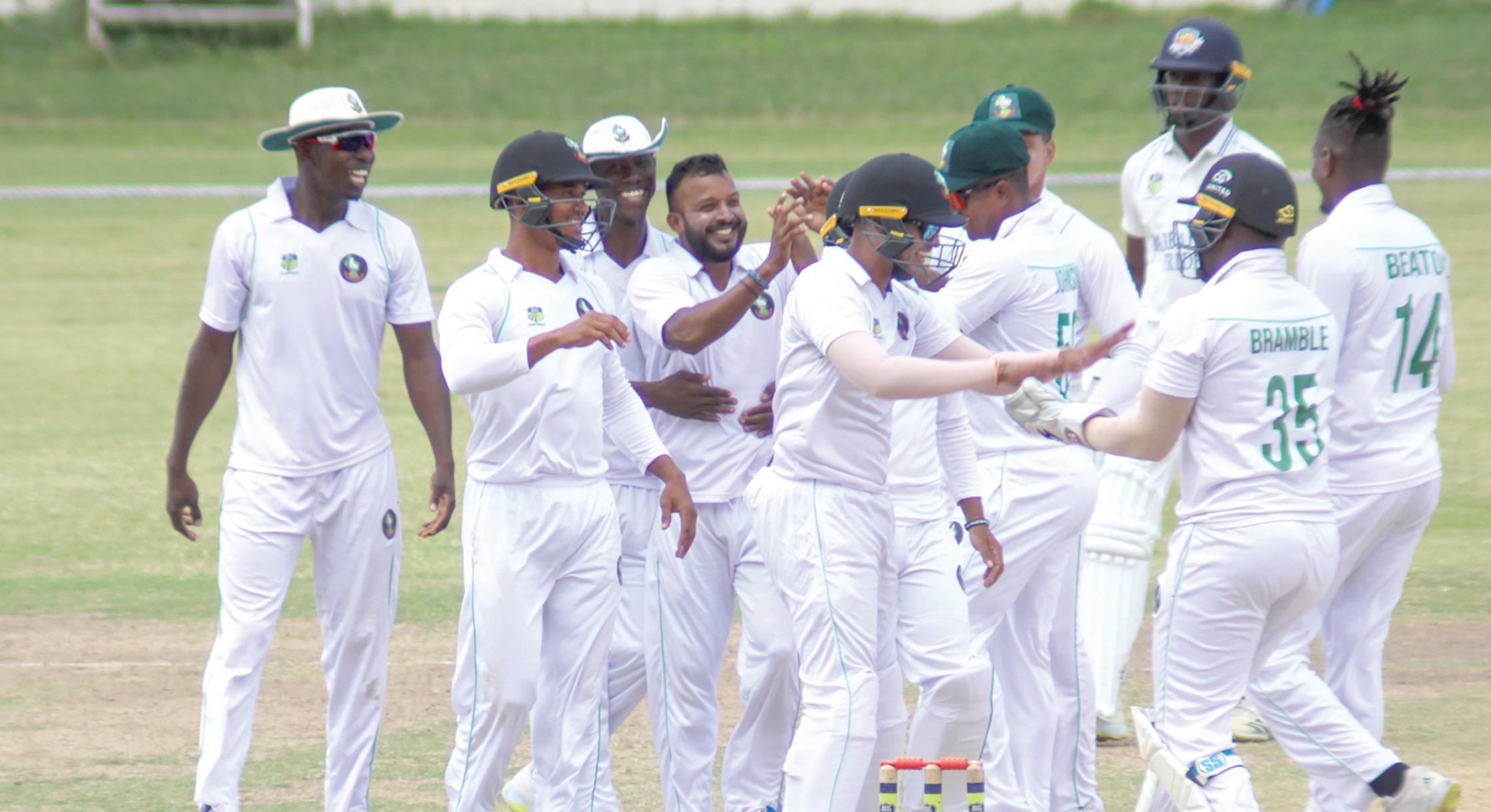 Tagenarine Chanderpaul bats Kraigg Brathwaite scores through the off-side Permaul bowls during round one of the West Indies championships Permaul went past 500 wickets in Antigua (Brandon Corlette photos) Brathwaite celebrates his century