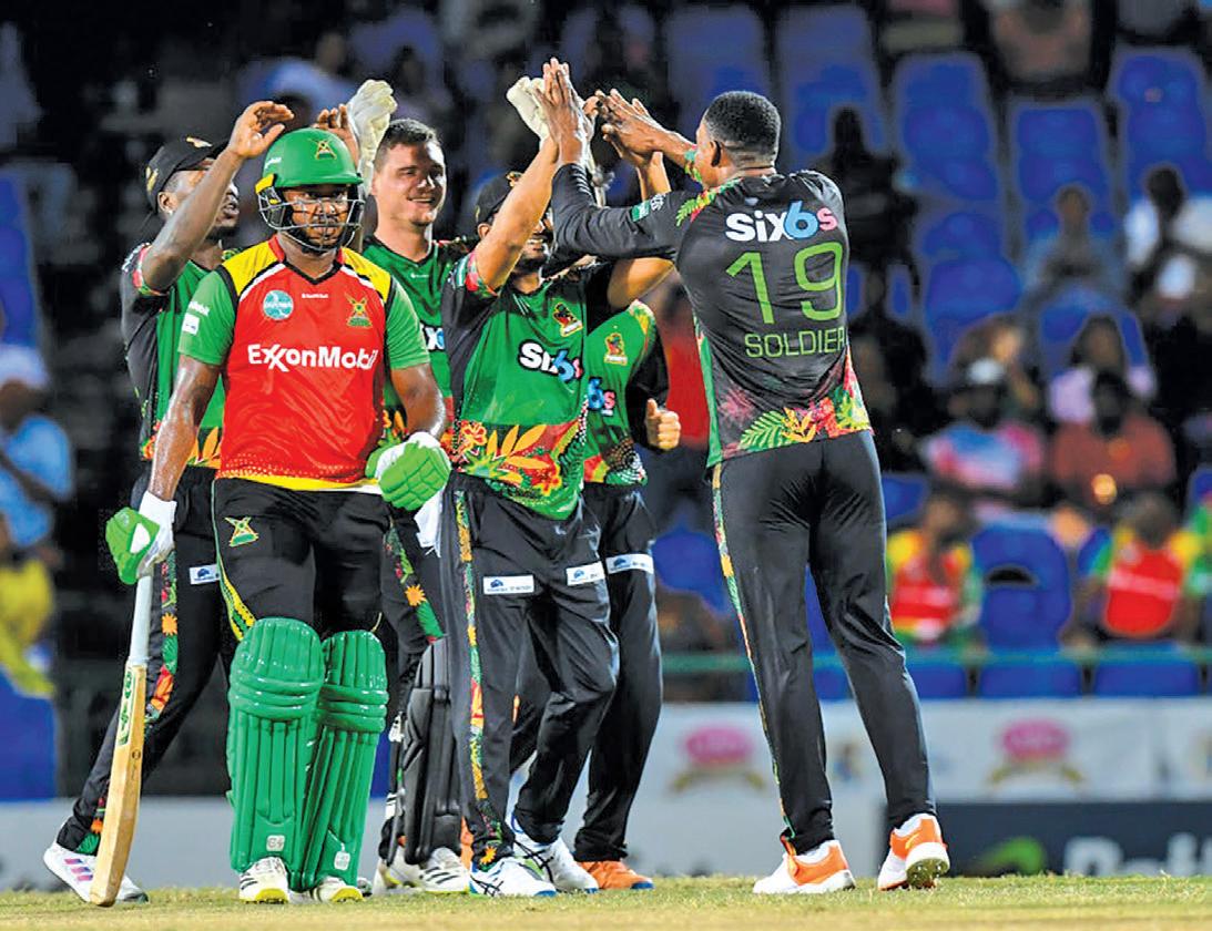TOTAL 16.5 Ov (RR: 7.84) 132 Fall of wickets: 1-7 (Andre Fletcher, 1.3 ov), 2-28 (Joshua Da Silva, 4.3 ov), 3-83 (Evin Lewis, 8.3 ov), 4-88 (Sherfane Rutherford, 9.3 ov), 5-104 (Dominic Drakes, 11.3 ov), 6-114 (Ambati Rayudu, 12.4 ov), 7-125 (Corbin Bosch, 14.1 ov), 8-126 (Kofi James, 14.5 ov), 9-126 (Sheldon Cottrell, 15.1 ov), 10132 (Izharulhaq Naveed, 16.5 ov)