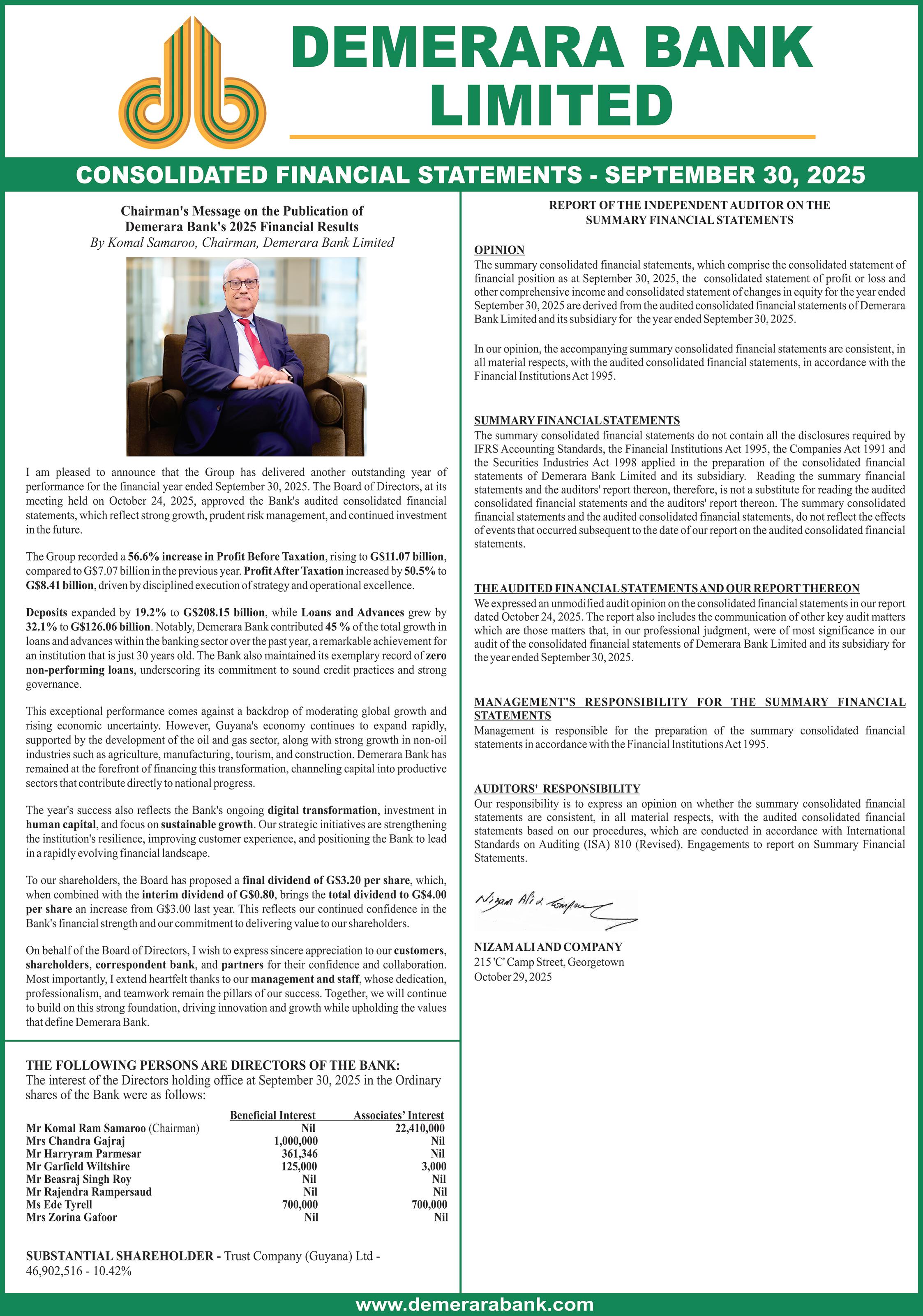According to DBL –Guyana’s only indigenous commercial bank, the 2025 performance not only underscores its exceptional profitability trajectory and prudent management, but also cements Demerara Bank’s