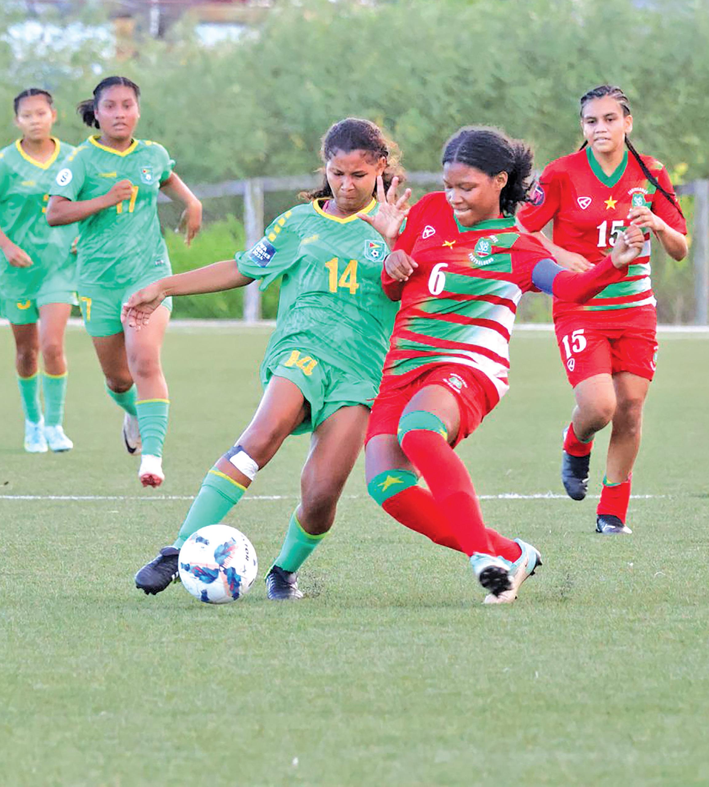 The first two games of the return leg in Guyana was hosted at the Guyana Football Federation’s National Training Centre (NTC) at Providence, East Bank Demerara (EBD), where the girls’ team got the ball rolling with 3-1 victory over Suriname’s girls.